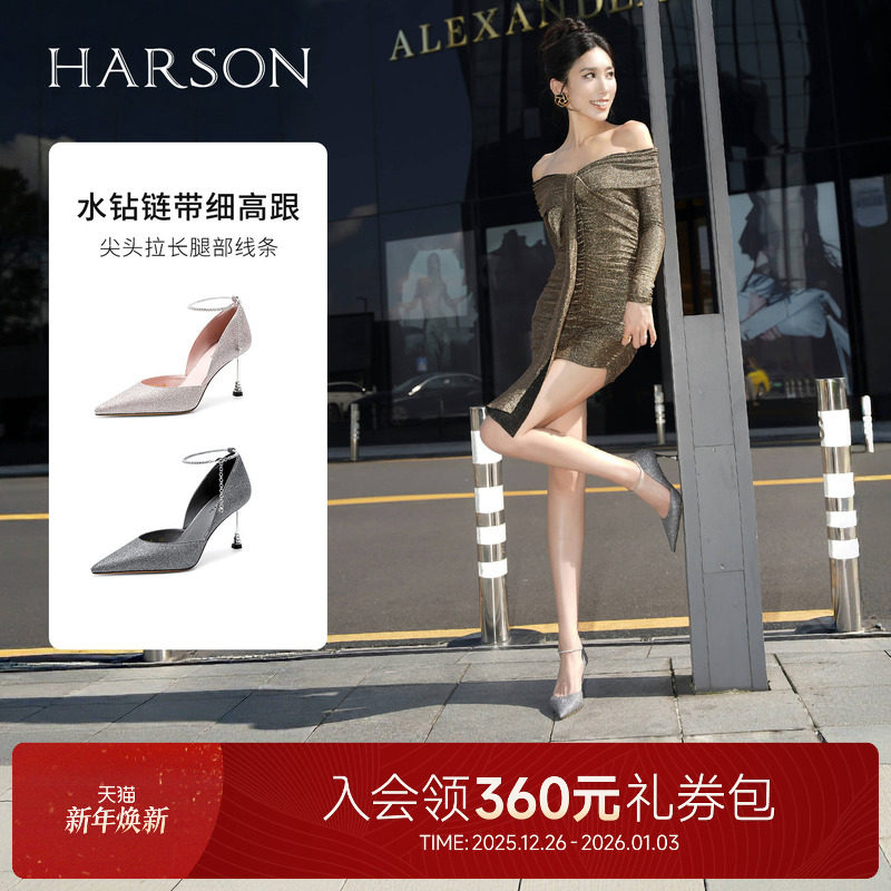 哈森/HARSON【小金条】25新款尖头高跟鞋6.5CM婚鞋宴会带脚链女鞋