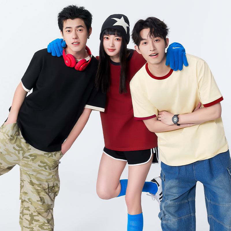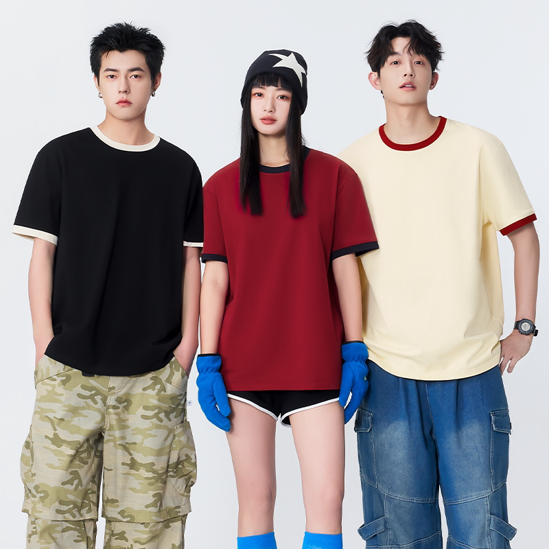 名创优品短袖男款夏季黑色高级感撞色拼接半袖重磅纯棉正肩t恤男A