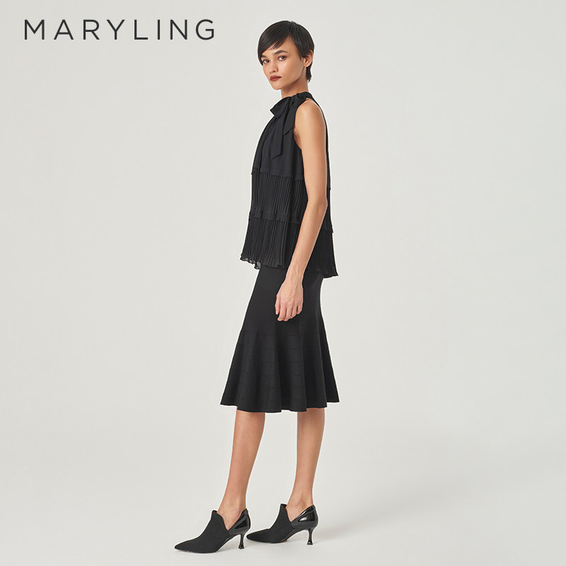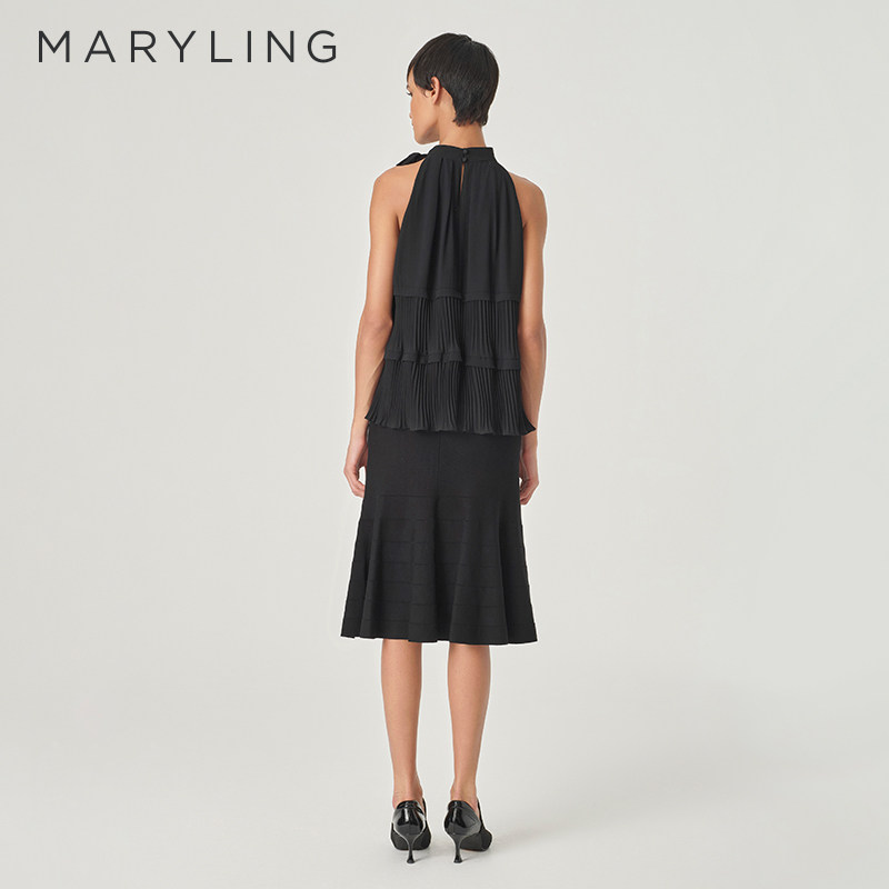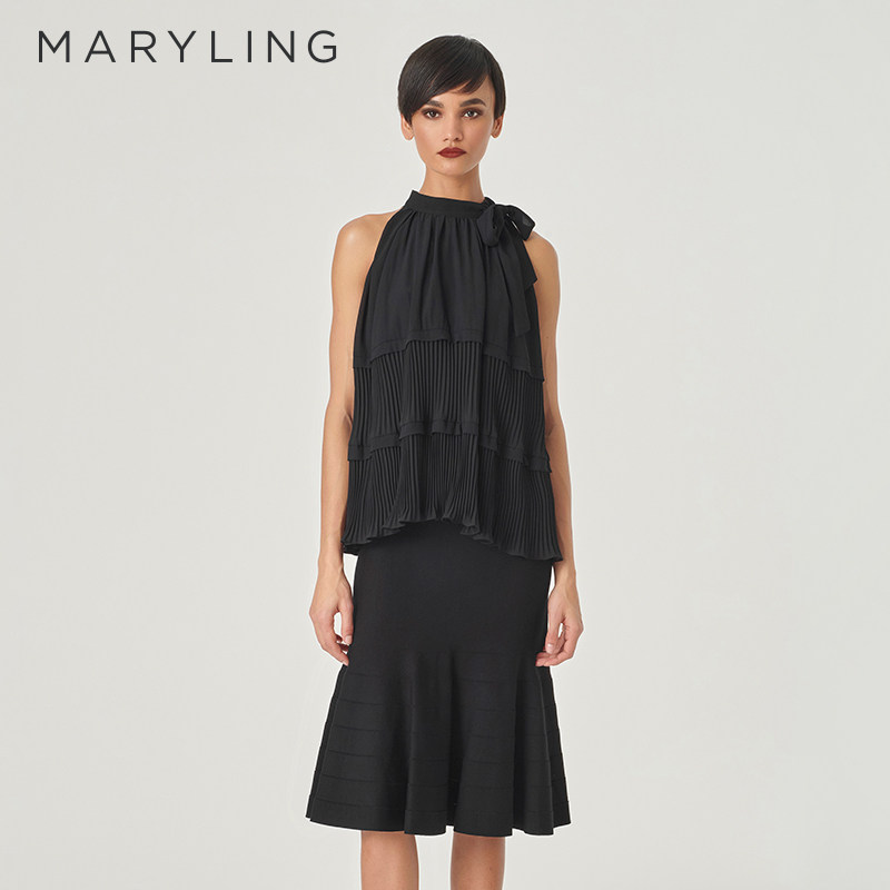 MARYLING玛俪琳夏季新品黑色露肩压褶塔塔上衣A1ECW26310