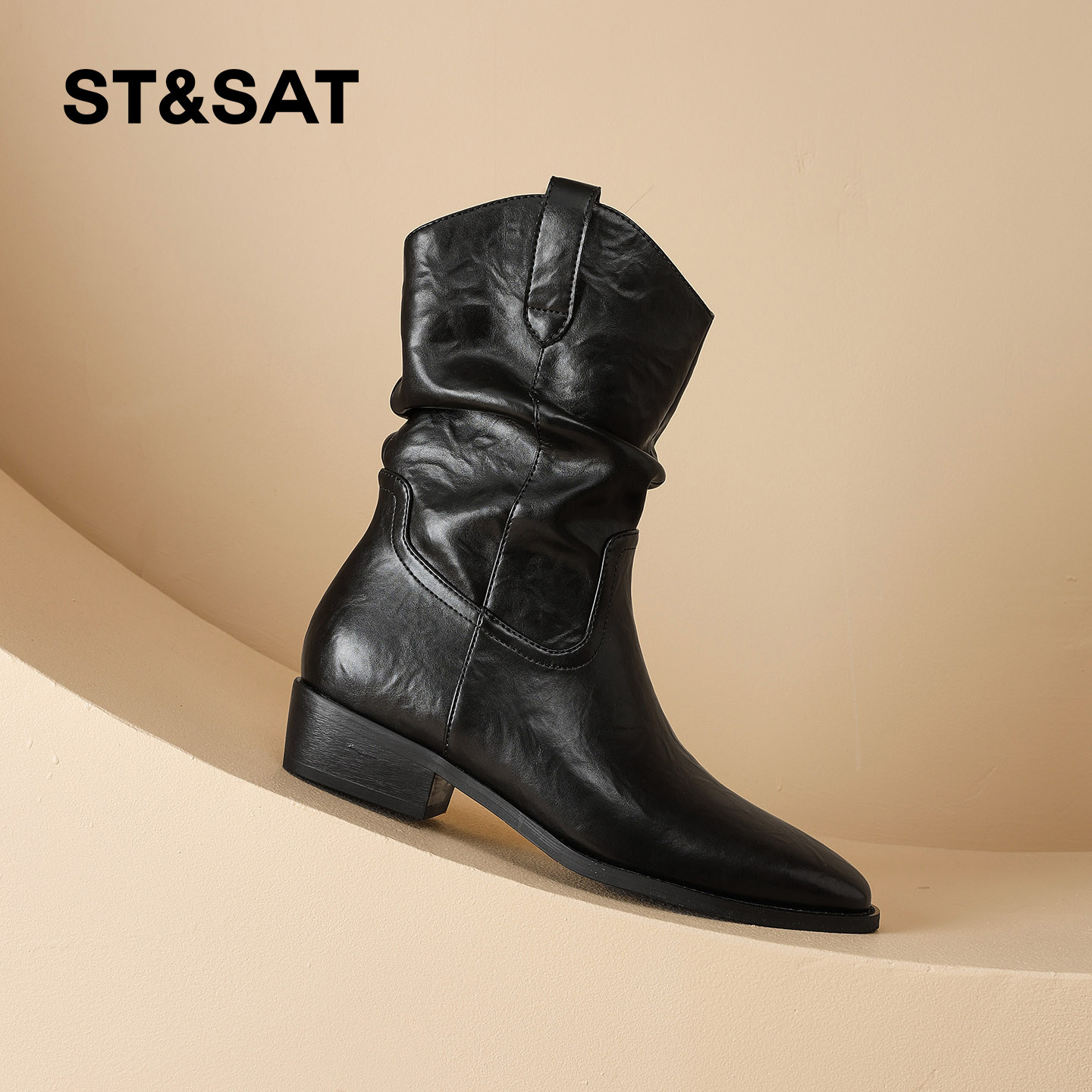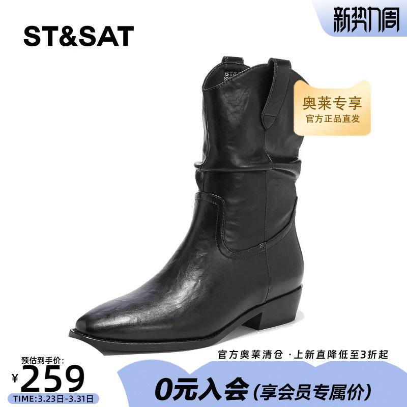 星期六粗跟加绒短靴女2025冬季新款西部风尖头切尔西靴复古堆堆靴