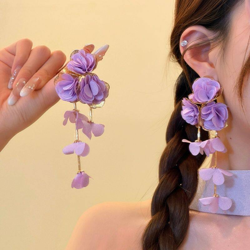 清酒山茶 粉色雪纺花朵流苏大耳环巨好看独特漂亮海边度假风耳饰