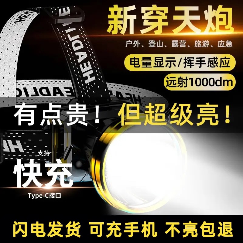 头灯2025新款强光超亮充电头戴式照明灯矿灯户外钓鱼专用感应矿灯