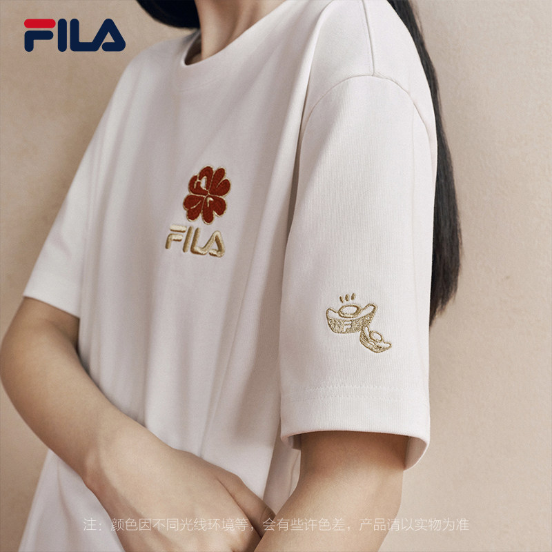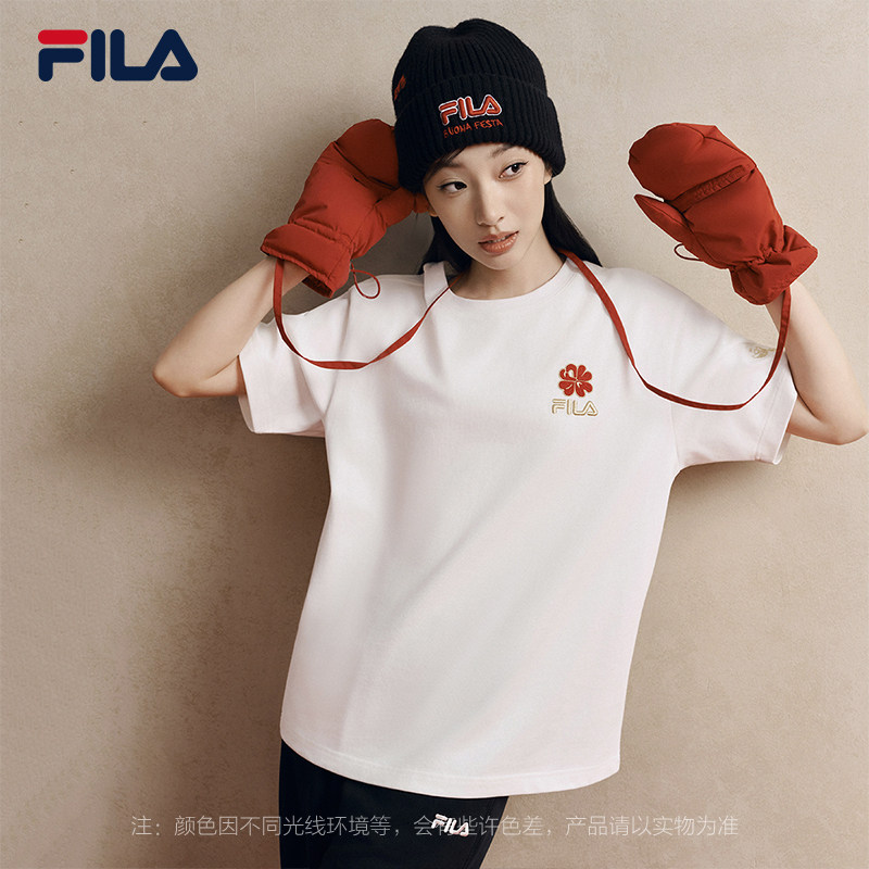 马上起飞FILA斐乐情侣短袖T恤2026春新年红色上衣男海棠花刺绣女