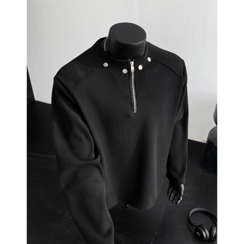 黑色半拉链长袖T恤男款秋冬季设计感铆钉拼接潮流痞帅打底衫上衣