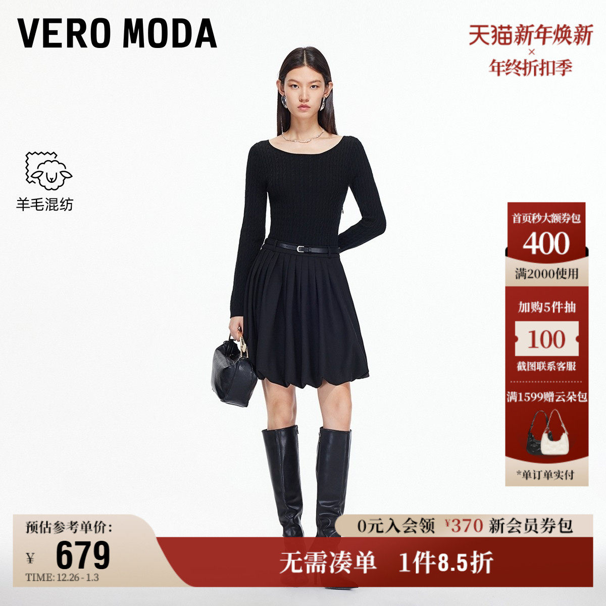 Vero Moda奥莱连衣裙女2025秋冬腰带泡泡裙摆针织拼接连衣裙高级