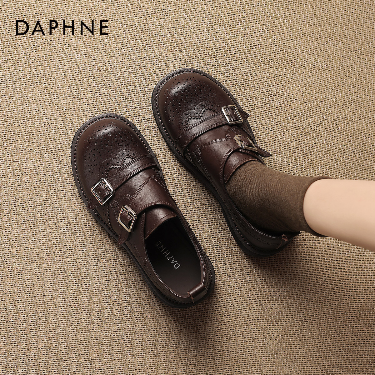 达芙妮复古棕色乐福鞋女款2026新款春季英伦风平底皮鞋布洛克单鞋
