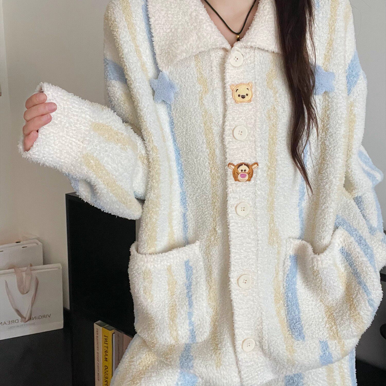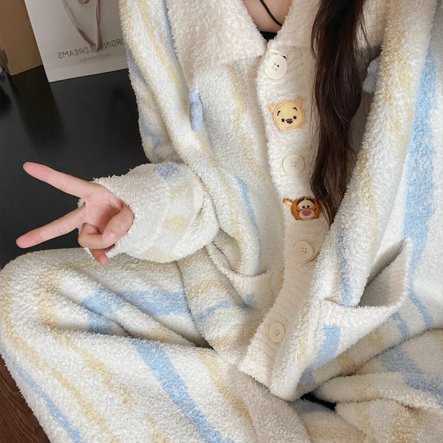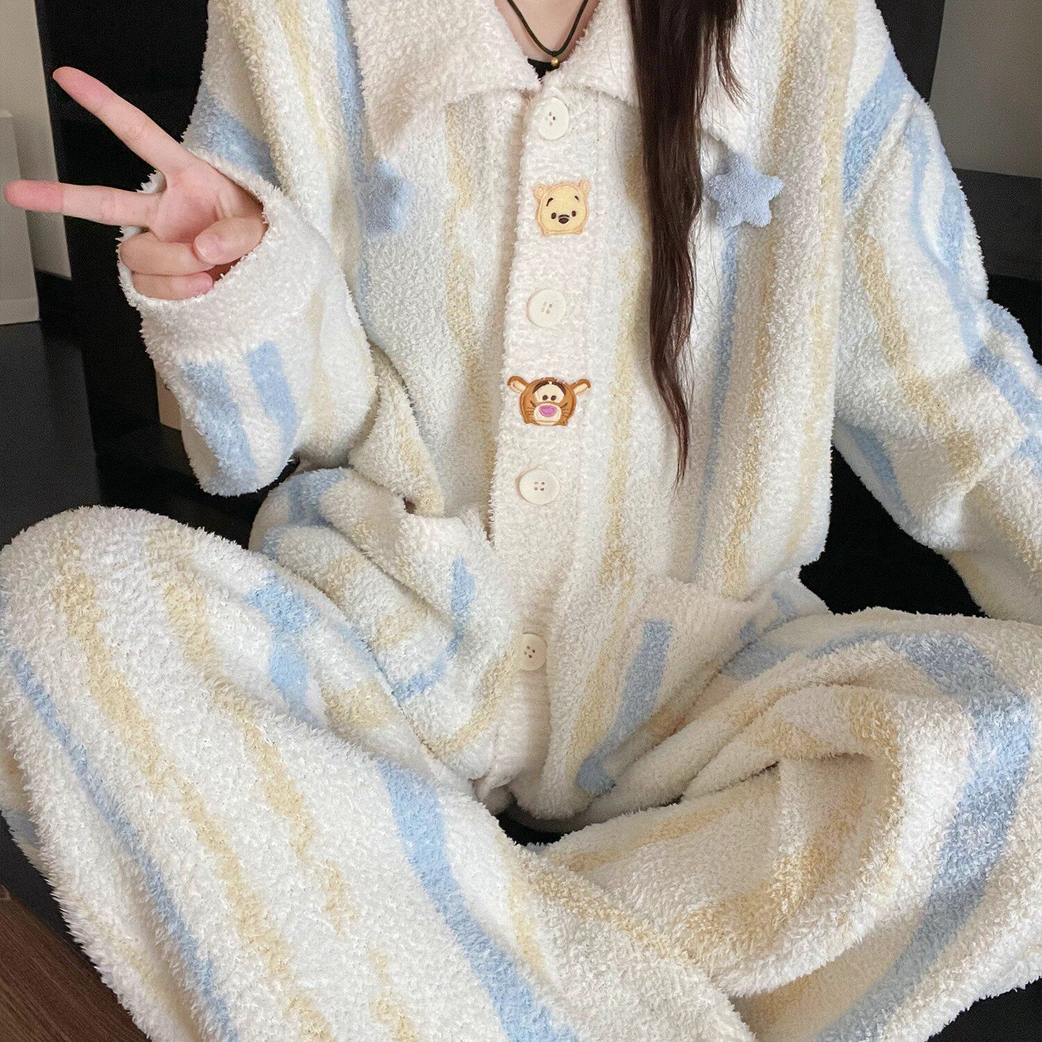 半边绒维尼熊保暖锁温睡衣女款秋冬可爱家居服套装新款红色黑色