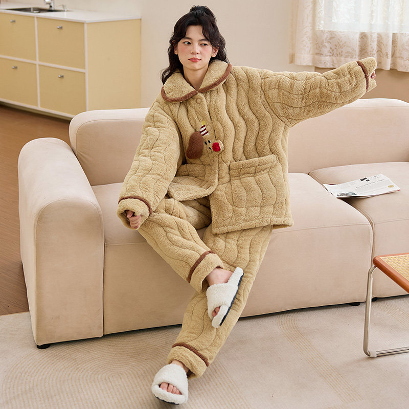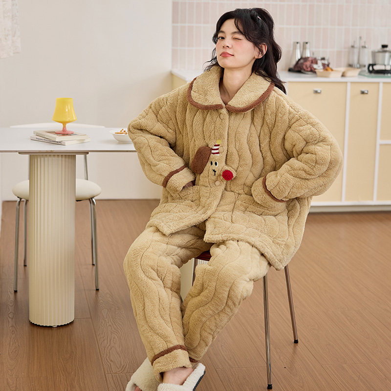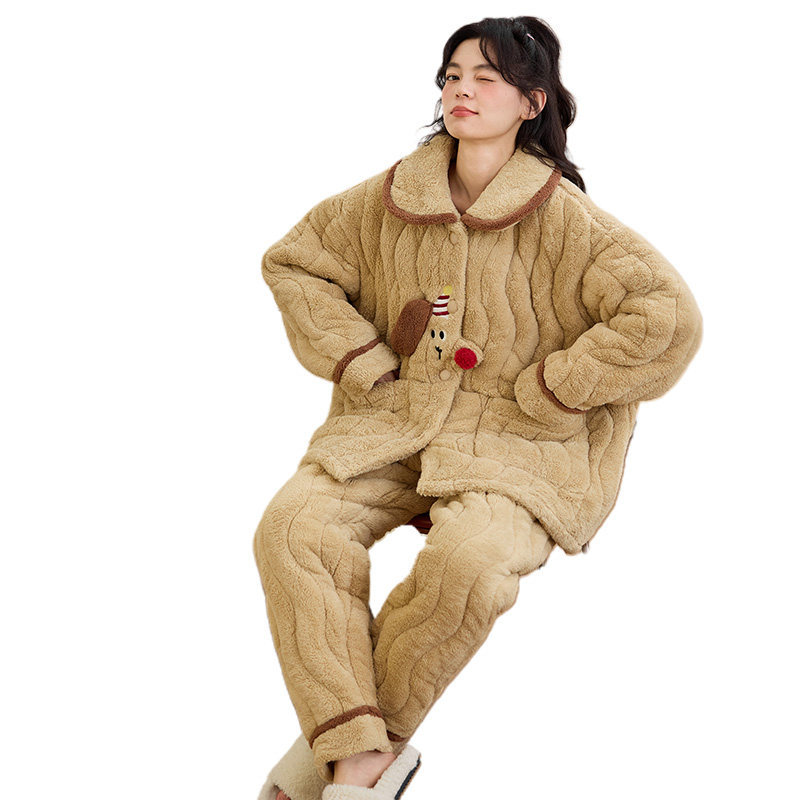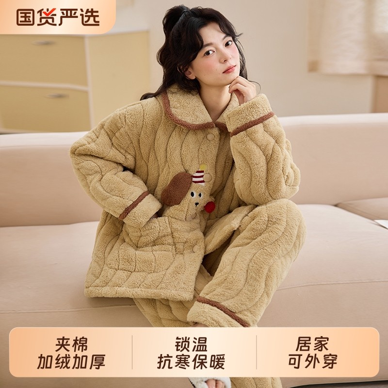 2025新款三层夹棉睡衣女秋冬款珊瑚绒加厚加绒保暖卡通女士家居服
