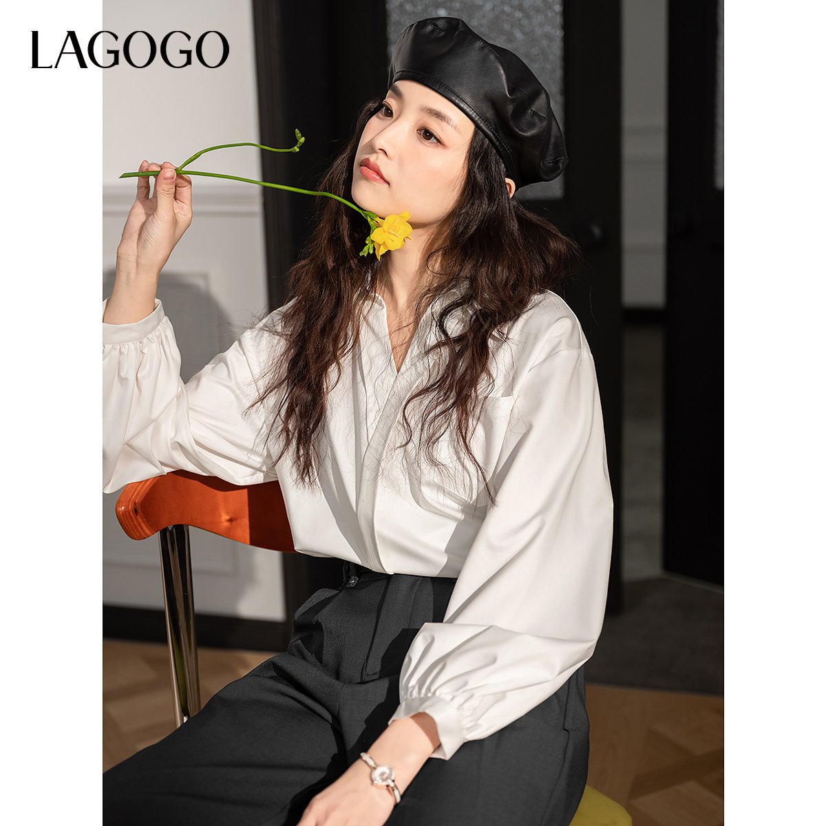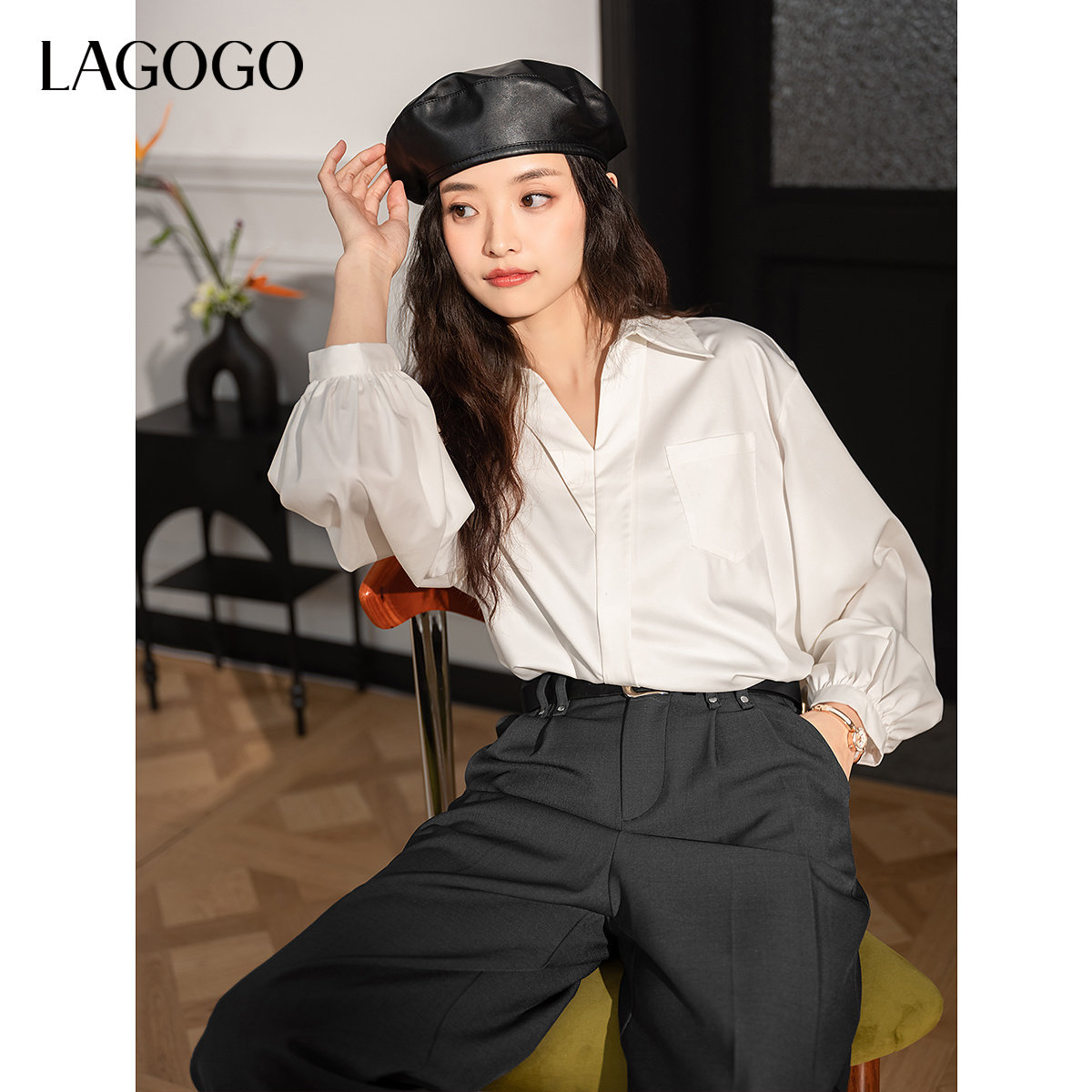 【抗菌】LAGOGO法式V领白色衬衫女拉谷谷2025秋冬新款免烫上衣