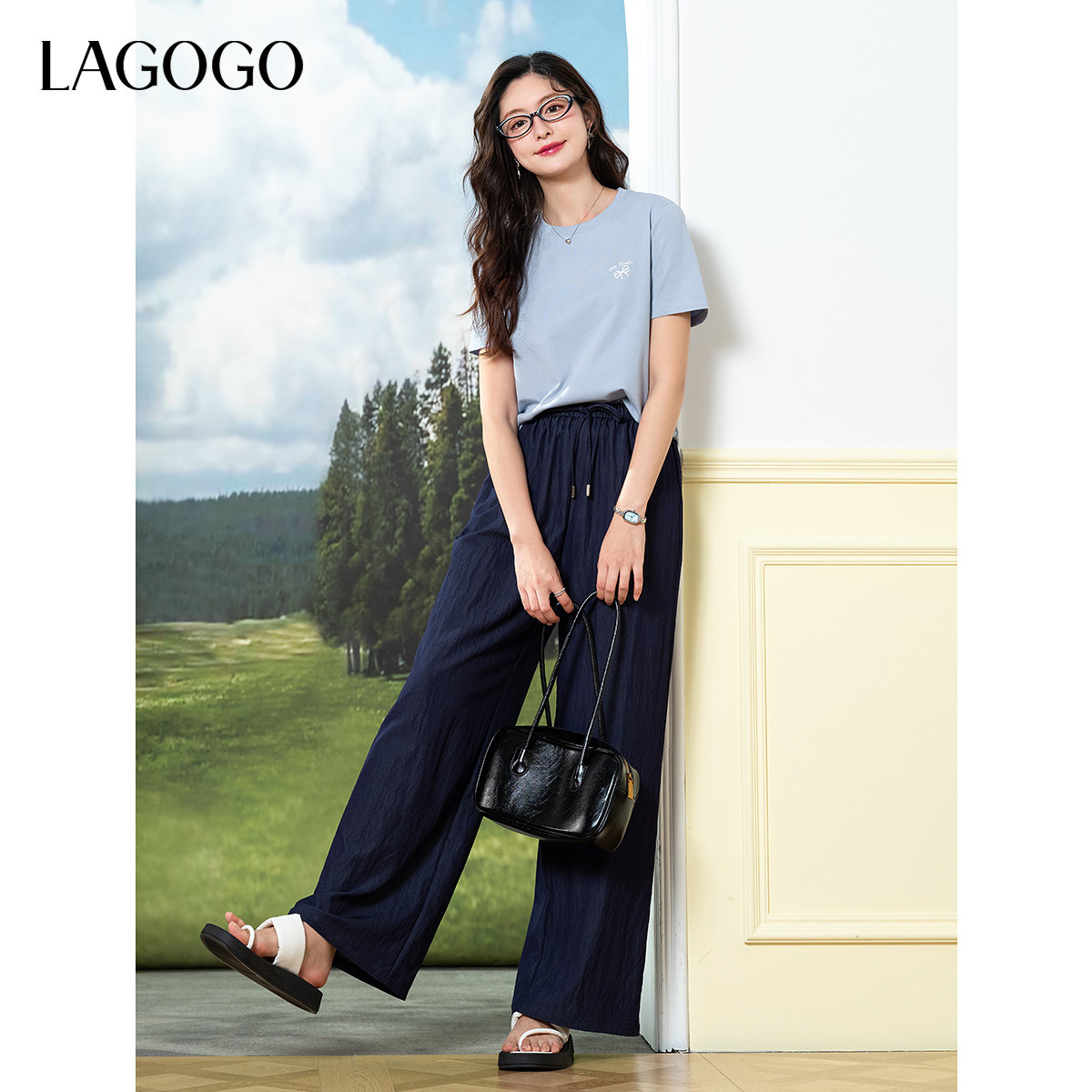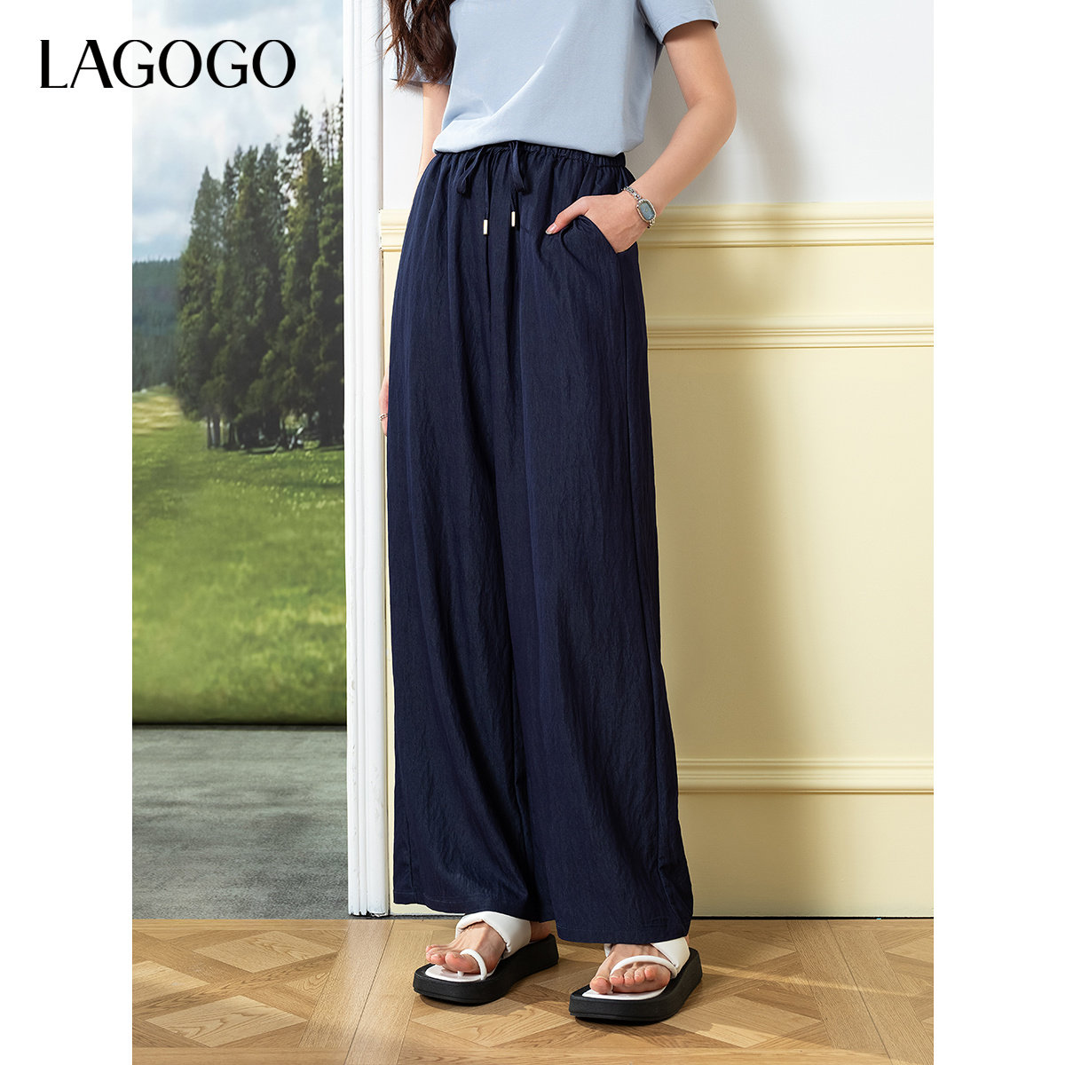 LAGOGO深牛仔蓝宽松直筒梧桐裤女拉谷谷夏季新款垂感山本裤