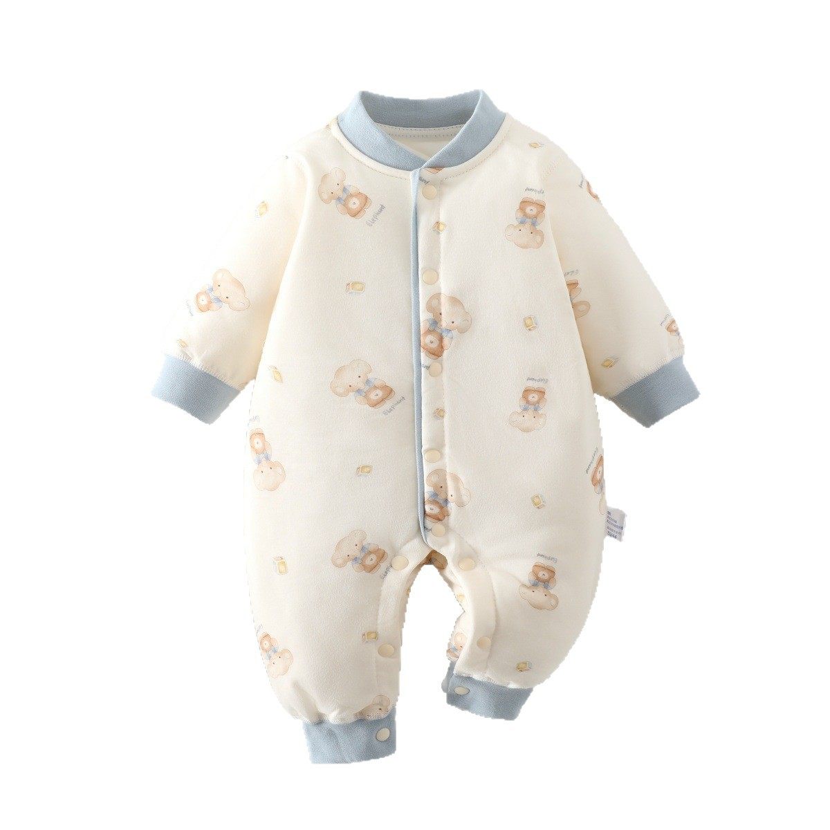小猪大卫新生儿秋冬夹棉连体衣男女宝宝卡通印花中开保暖爬服