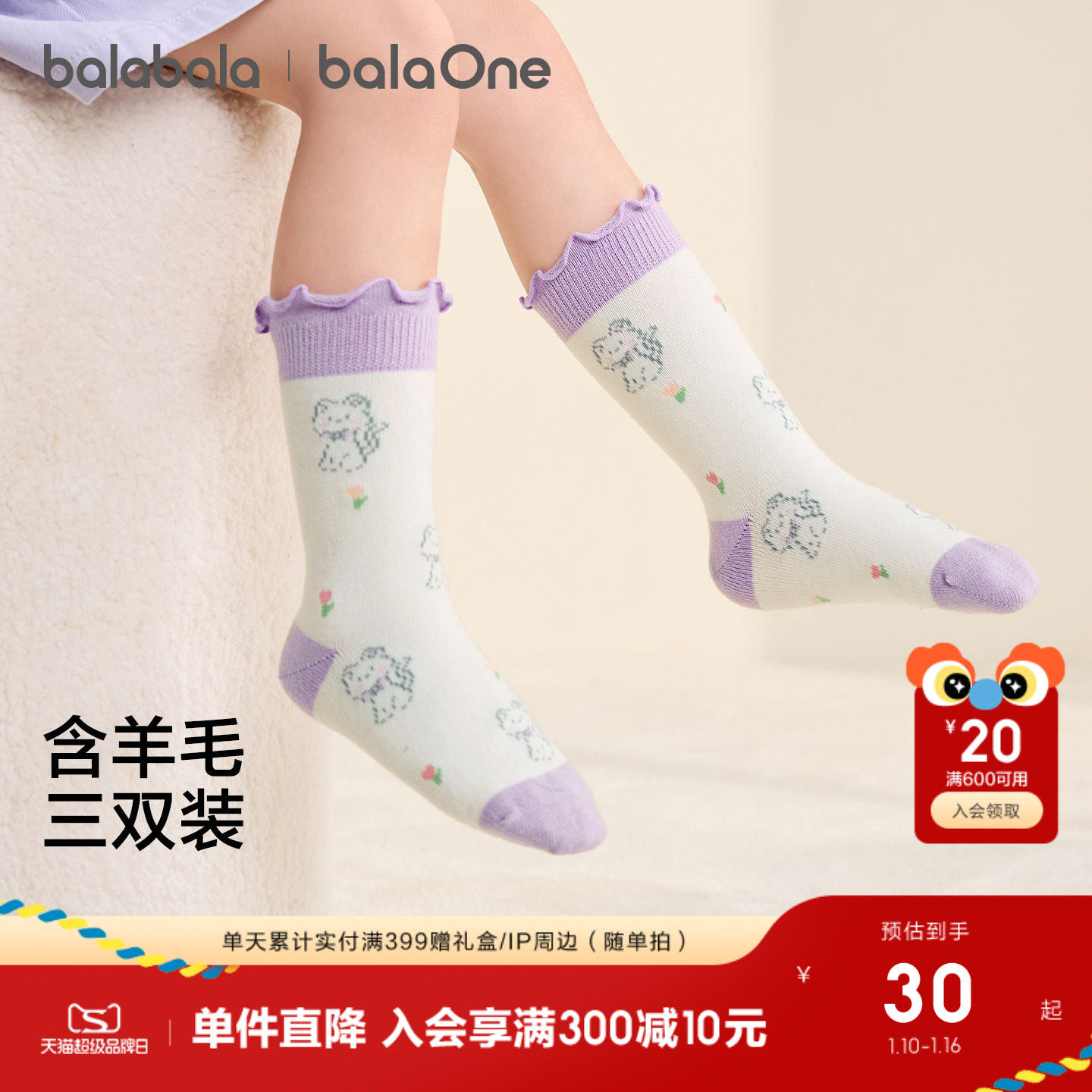 【balaOne】巴拉巴拉儿童袜子秋冬新女童袜子中大童含羊毛三双装