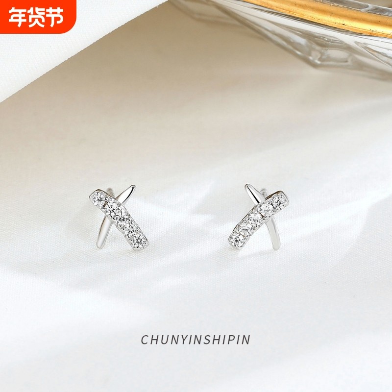 s925纯银镶钻字母X耳钉百搭交叉耳环简约耳饰个性耳骨钉配饰女