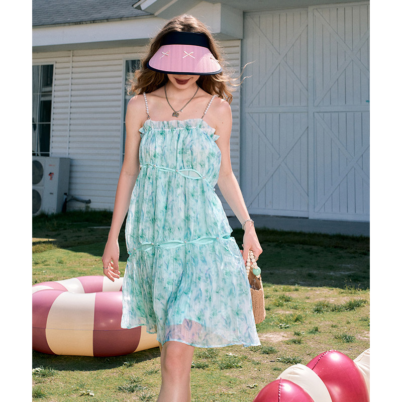 妖精的口袋蓝色印花雪纺吊带连衣裙女2025年夏季新款显瘦甜美裙子