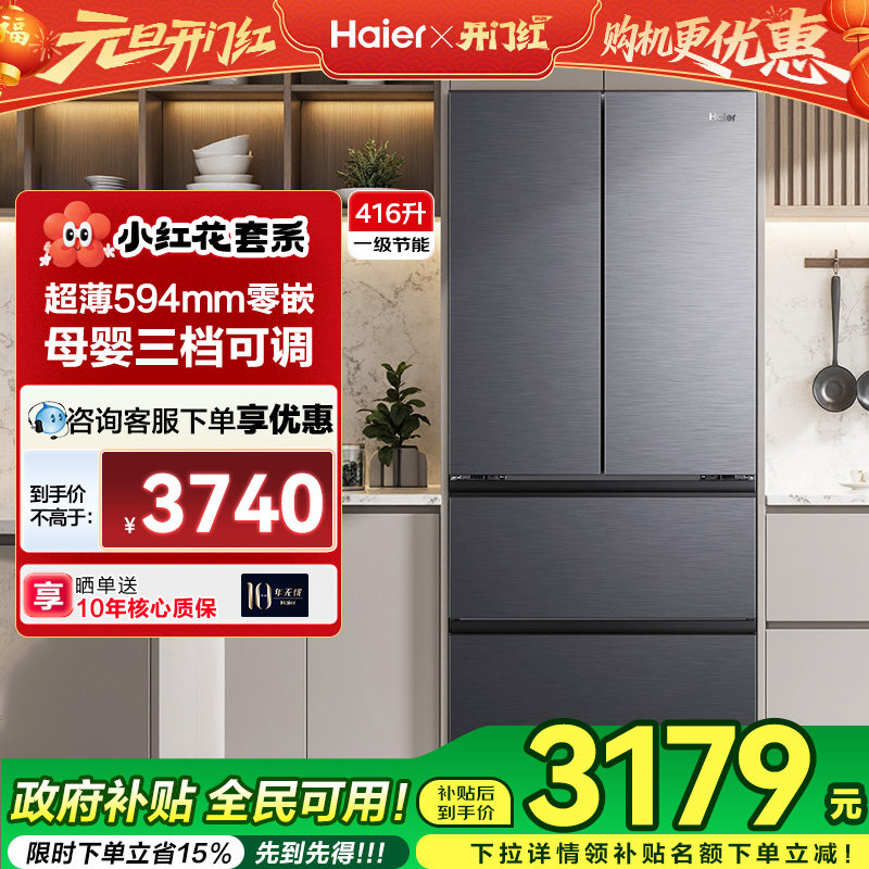 [政府补贴]海尔冰箱416L法式对开门超薄零嵌风冷无霜小红花旗舰店