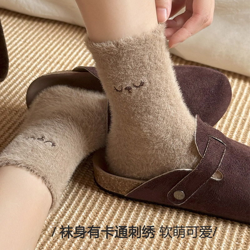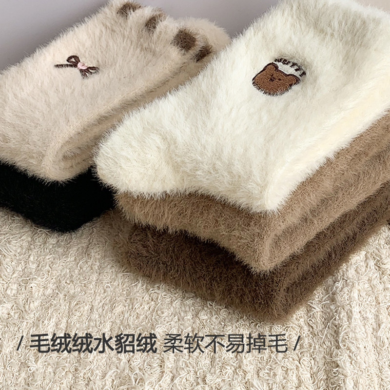 水貂绒袜子女秋冬季毛绒保暖中筒袜加绒加厚冬天居家长袜白色黑色