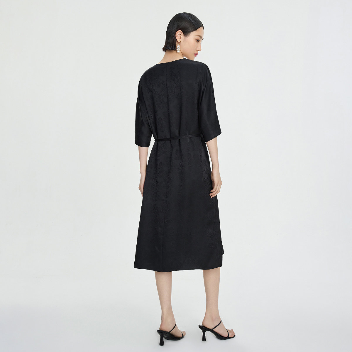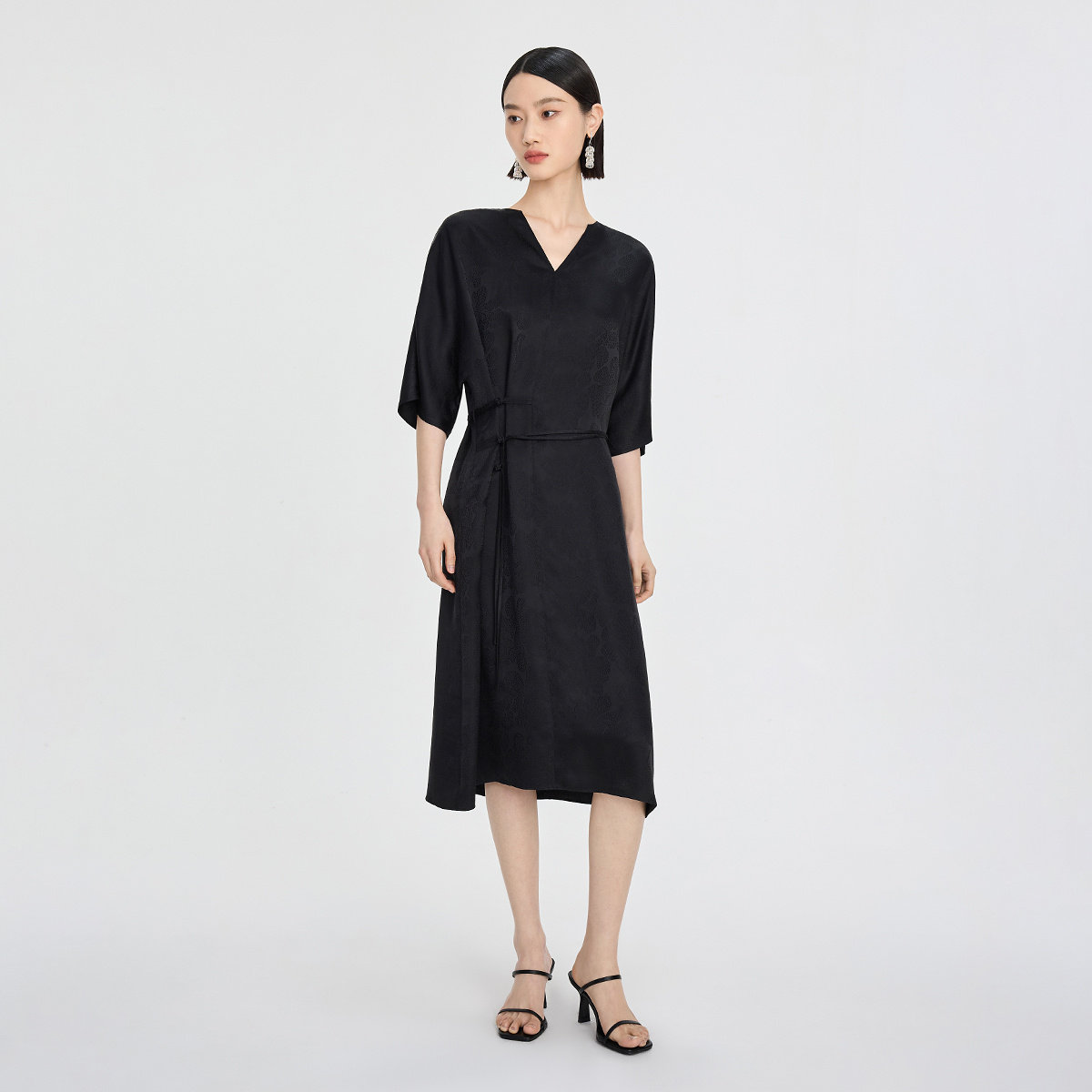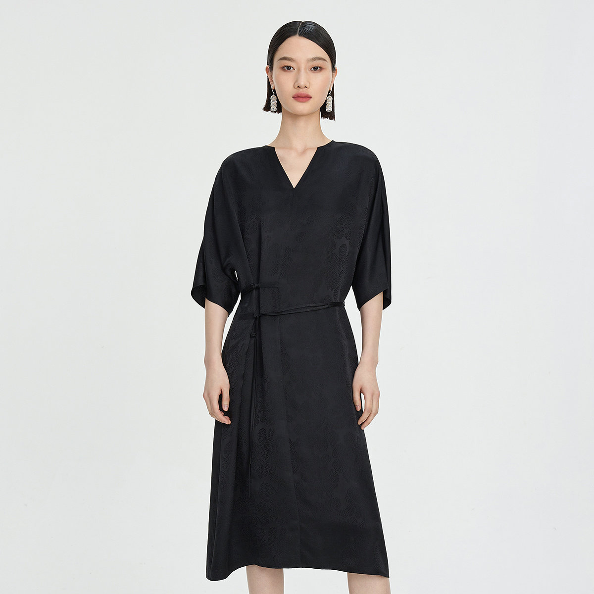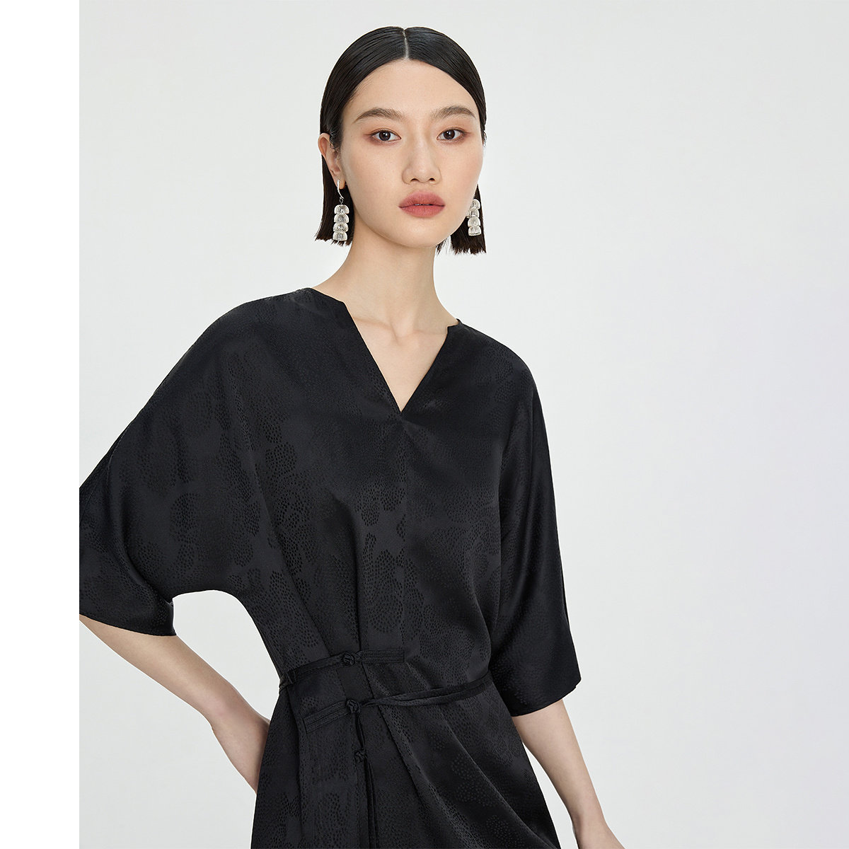 naivee纳薇新中式女装V领宽松真丝连衣裙桑蚕丝提花赴宴轻礼服女