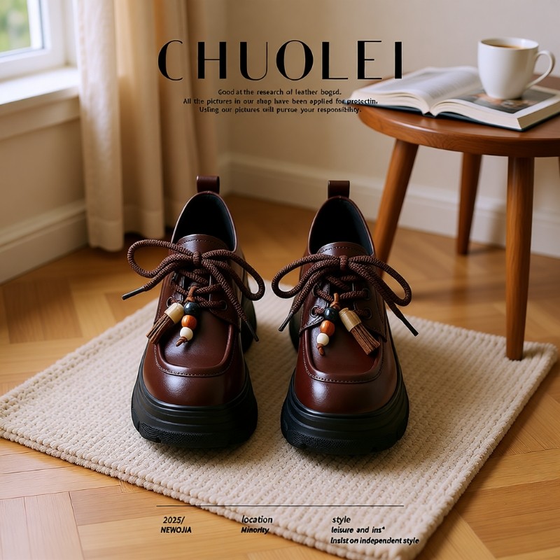 2025夏季新款厚底乐福鞋女棕色系带粗高跟英伦风小个子松糕小皮鞋