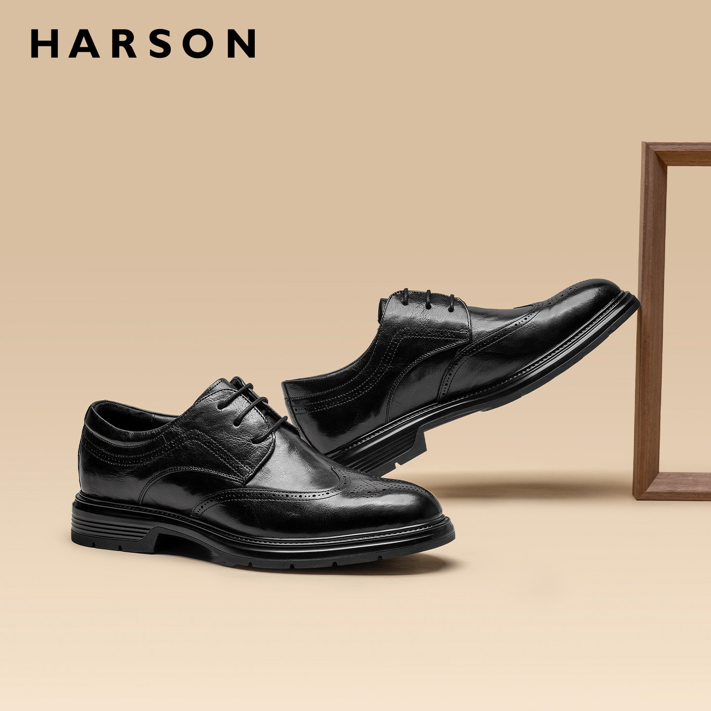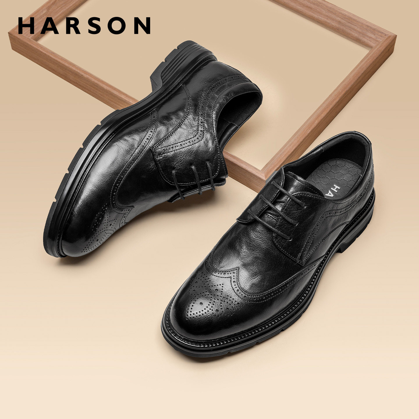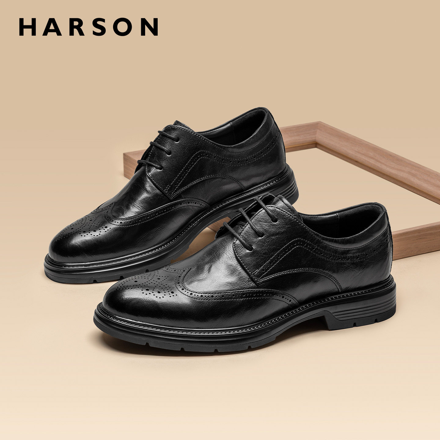 哈森男鞋商务休闲皮鞋男新郎结婚手工布洛克德比鞋真皮舒适软底鞋