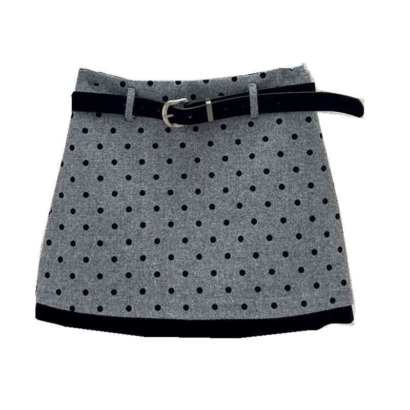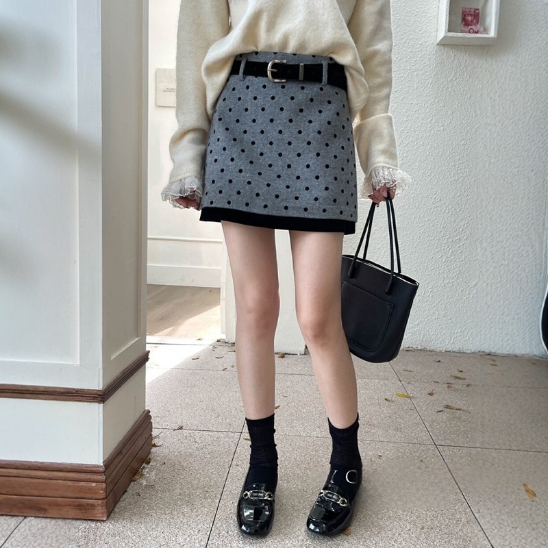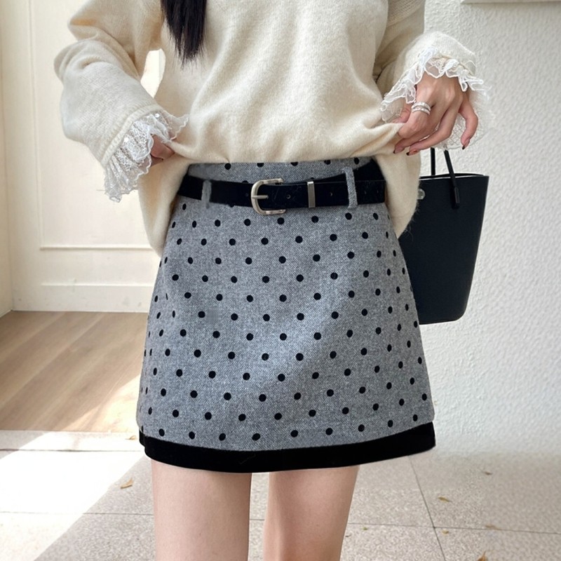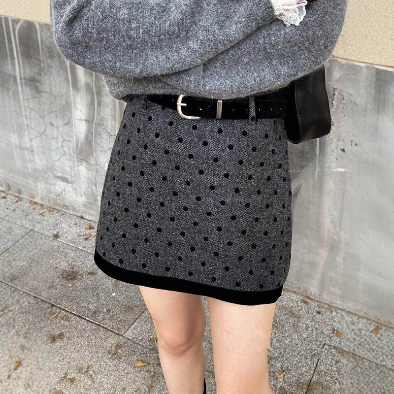 韩系灰色波点印花羊毛呢半身裙女秋冬大码小个子高腰a字包臂短裙