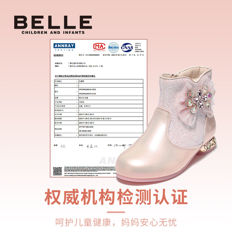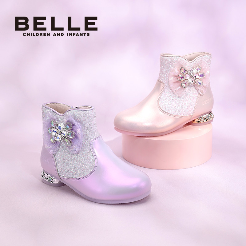 百丽童鞋女童公主靴加绒保暖短靴子冬季新款小女孩水晶靴儿童皮靴