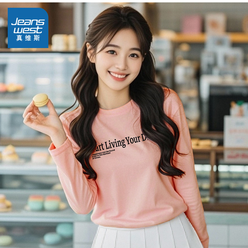 YD真维斯女装甜美字母印花长袖T恤 2025秋季新品 纯棉女式上衣潮