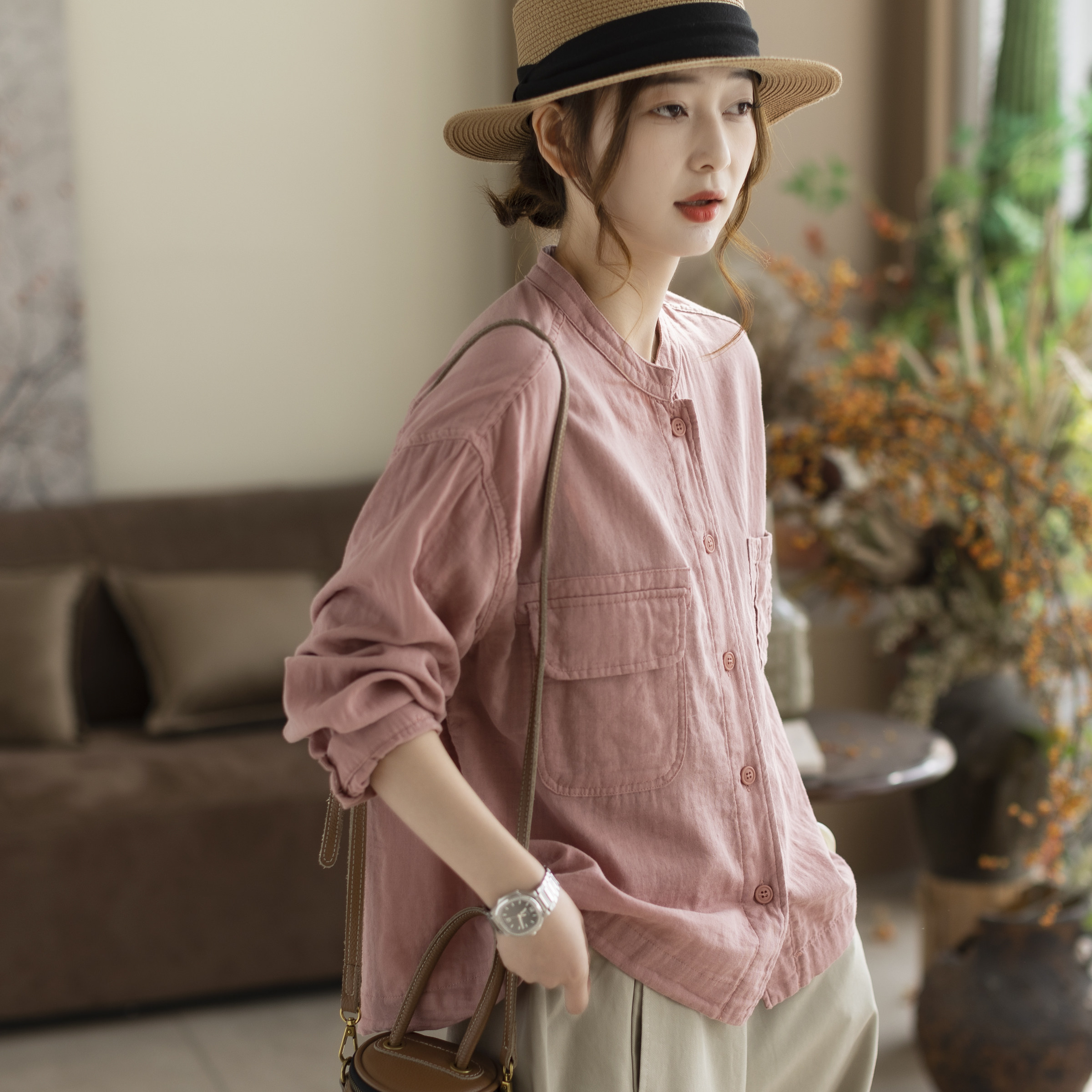 春季新款复古文艺纯棉长袖衬衫女宽松休闲灯芯绒上衣方领时尚衬衣