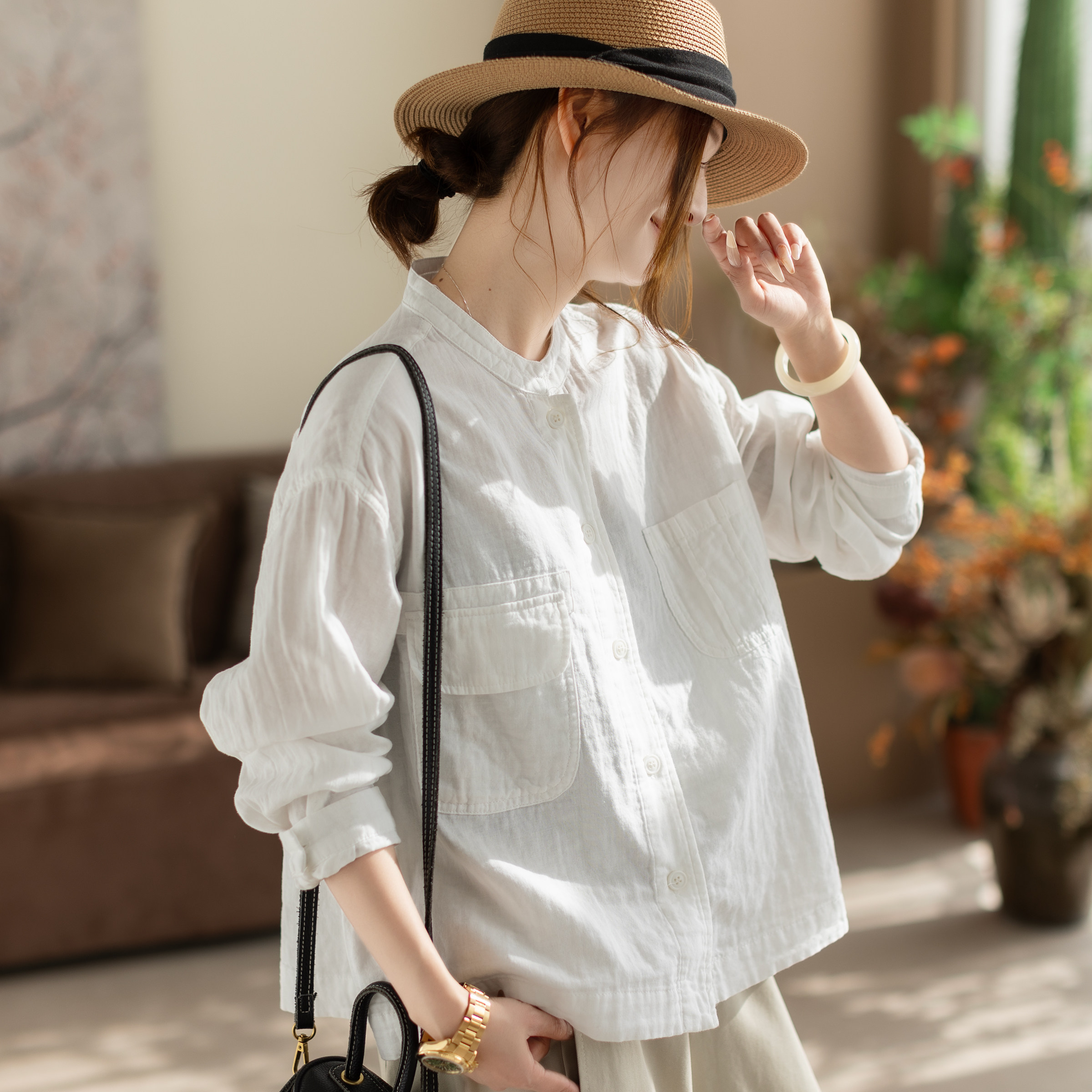 COCOBELLA设计感小立领黑白条纹衬衫外套女仿棉麻休闲衬衣SR0019