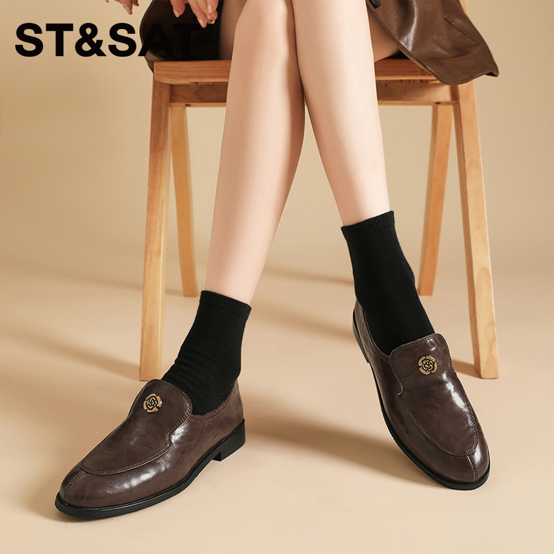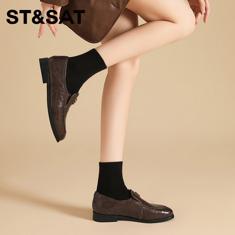 星期六法式复古真皮圆头平跟凉鞋轻奢女鞋浅口时尚通勤气质单鞋女