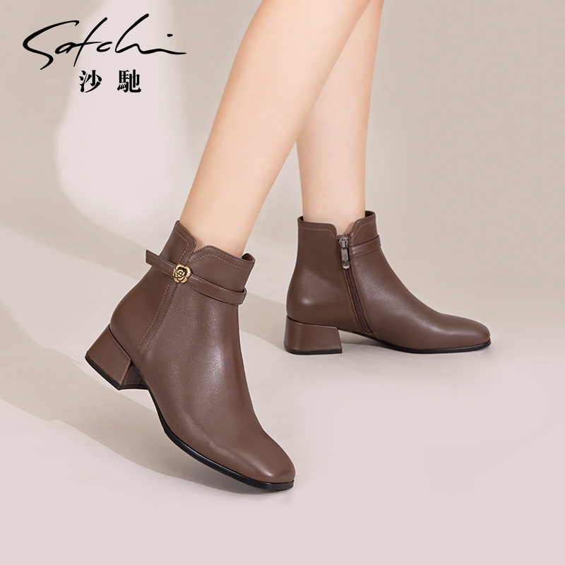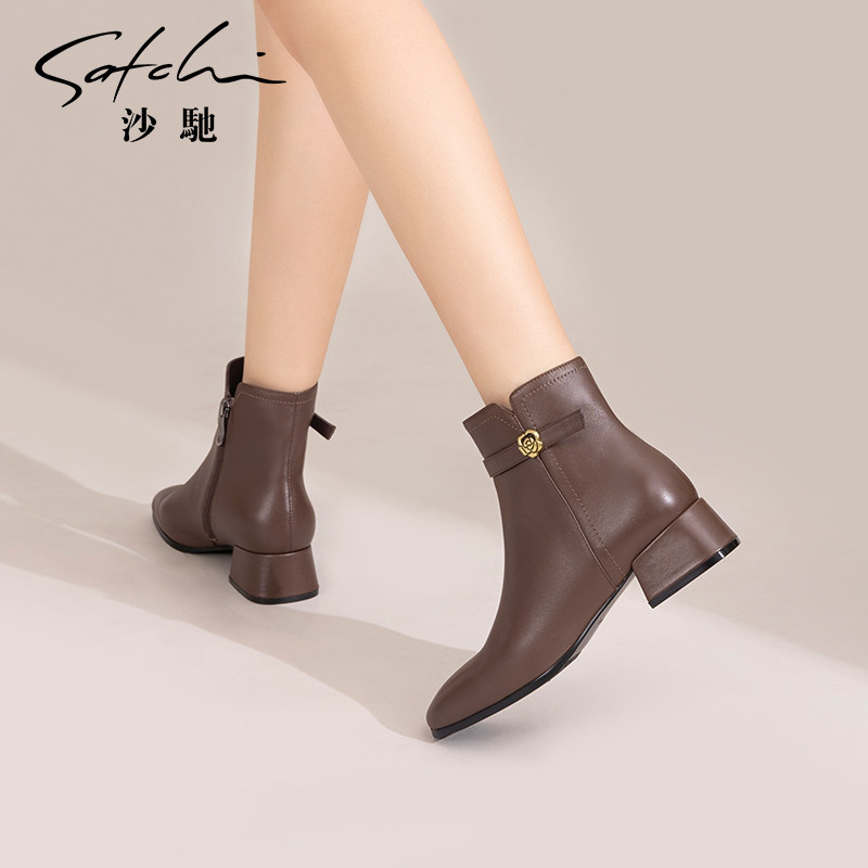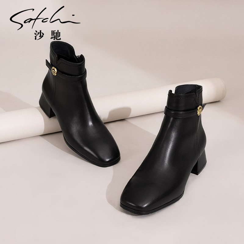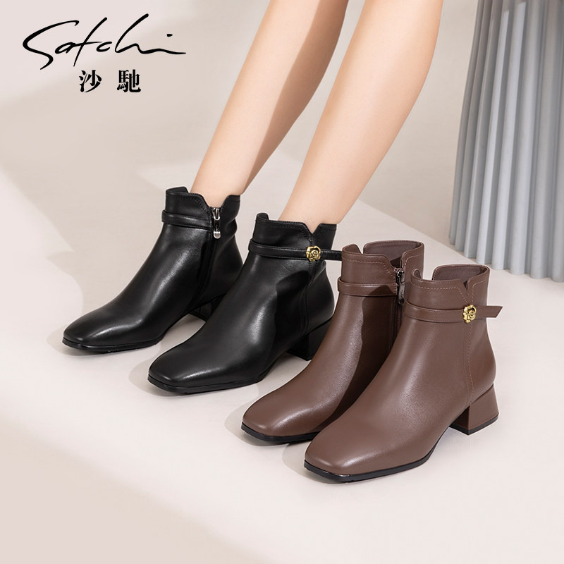 沙驰女鞋时尚真皮短靴女2025秋冬新款粗中跟时装靴小方头通勤裸靴