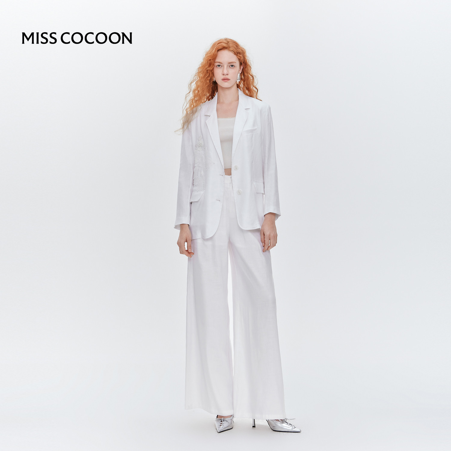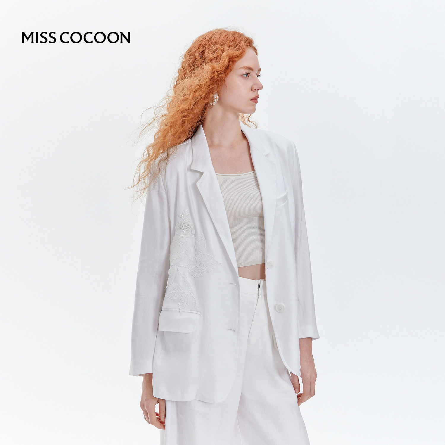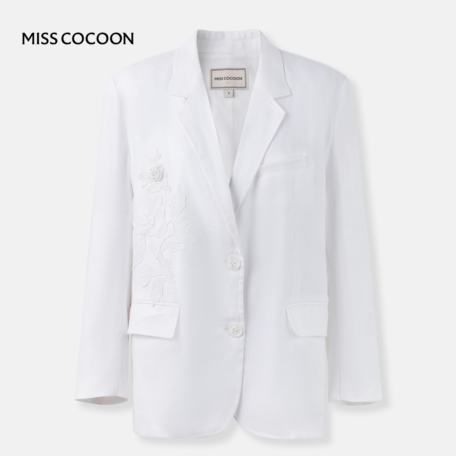 MISS COCOON可可尼宽肩亚麻西装外套2025秋季新款重工蕾丝西服女
