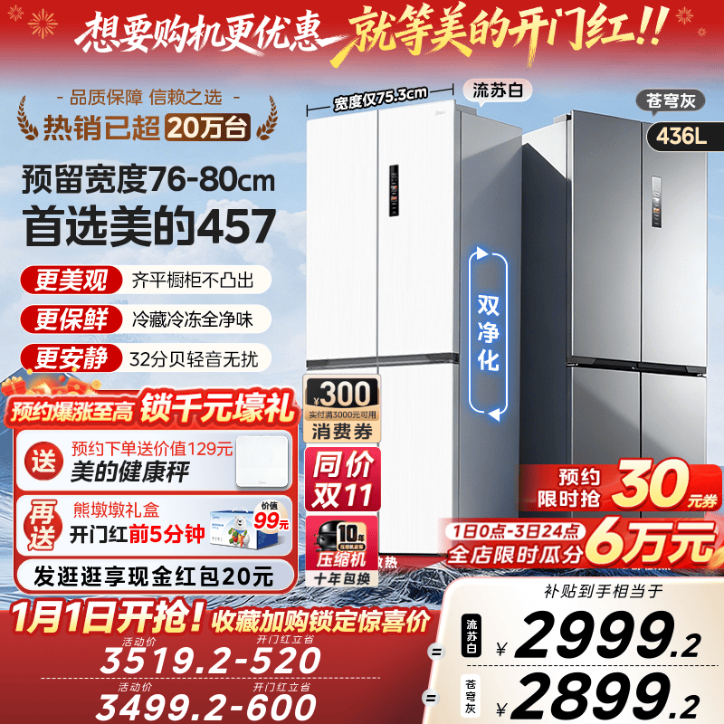 美的457超薄零嵌入式十字双开四门电冰箱家用小户型风冷无霜一级