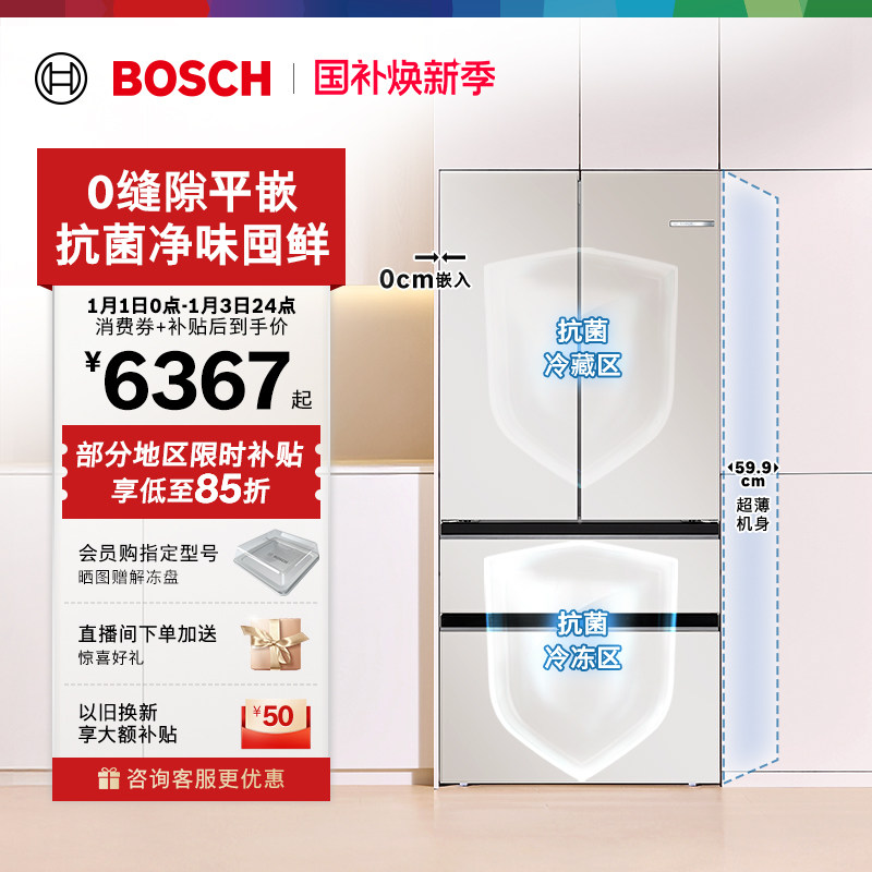 博世504L玻璃零嵌入式双循环冰箱家用拿铁白一级F8s平嵌法式多门