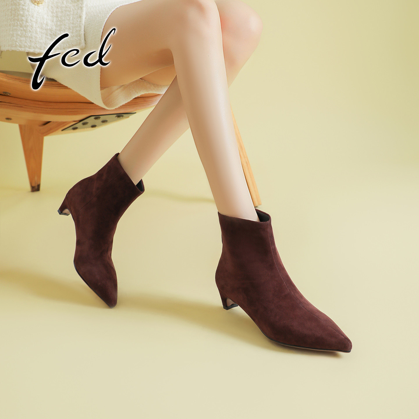 fed法式复古磨砂羊皮粗跟瘦瘦靴女秋冬新款后拉链中跟尖头小短靴
