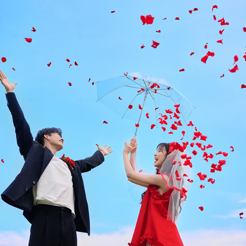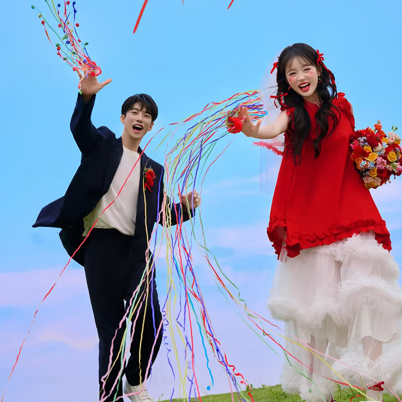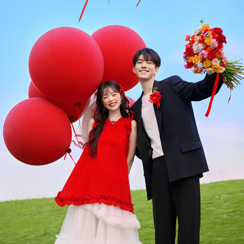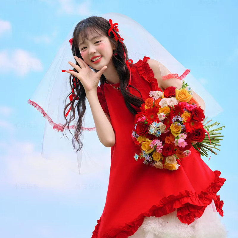 婚纱照外景街拍新中式中国红秀禾纱裙红色背景布手捧花红头纱