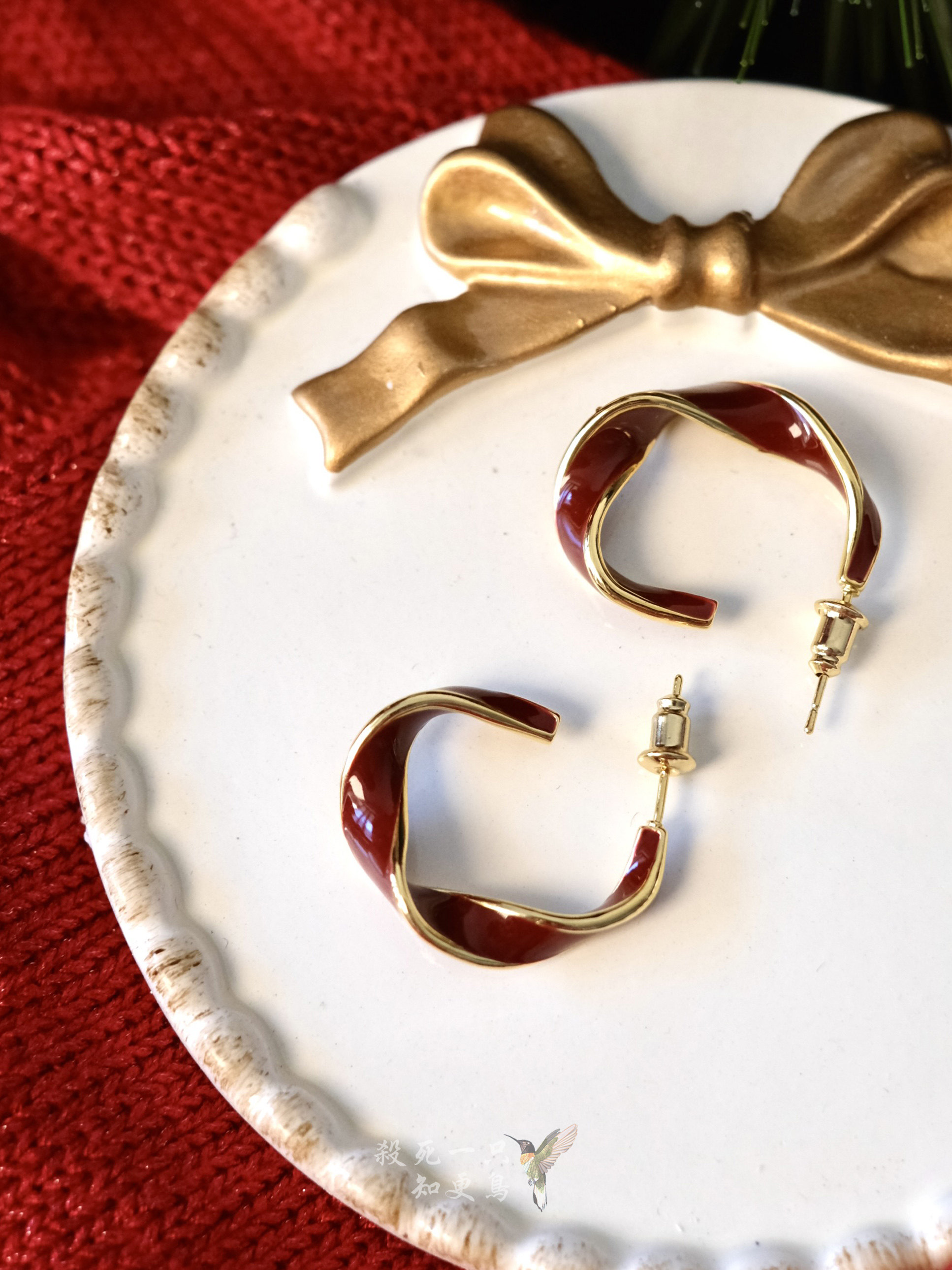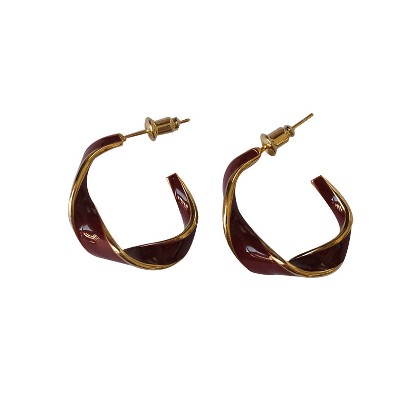 《红丝带》慵懒时髦酒红色法式简约扭曲圆环珐琅釉耳圈耳钉耳夹女