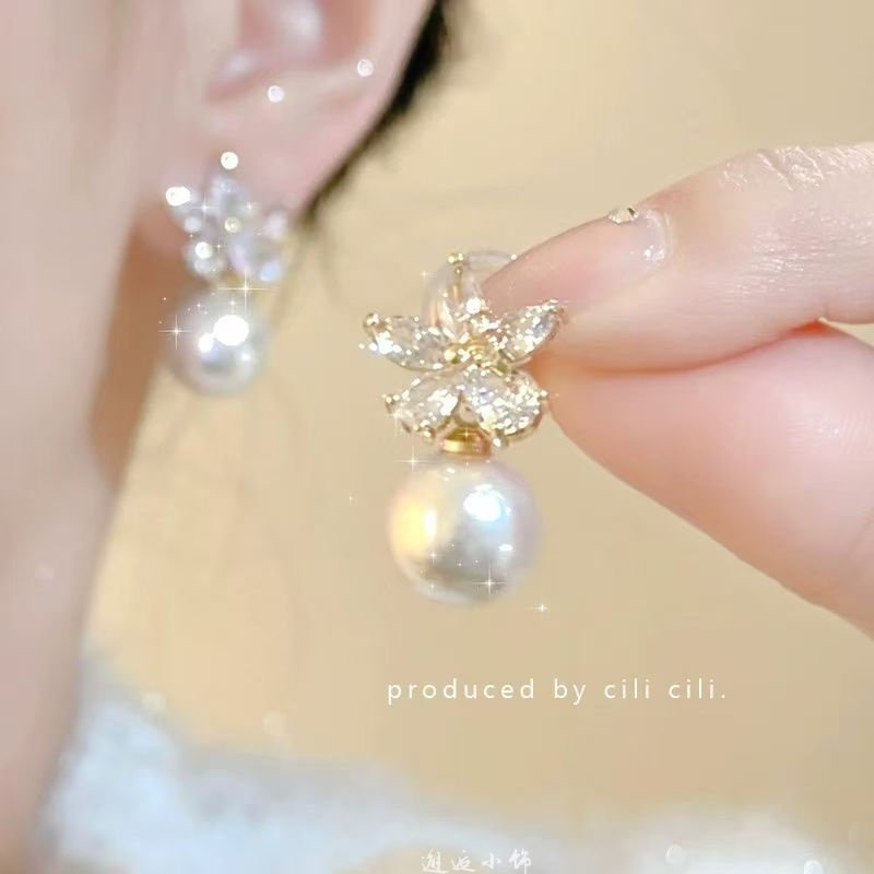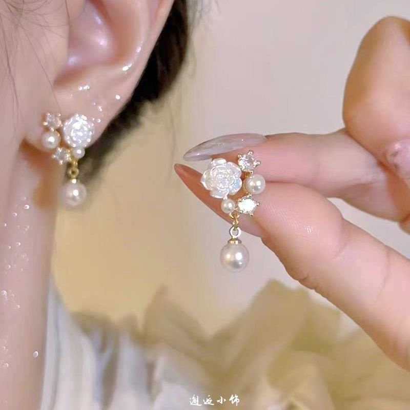 奶霜山茶温柔小香风花朵珍珠流苏无耳洞蚊香盘耳夹法式耳环女