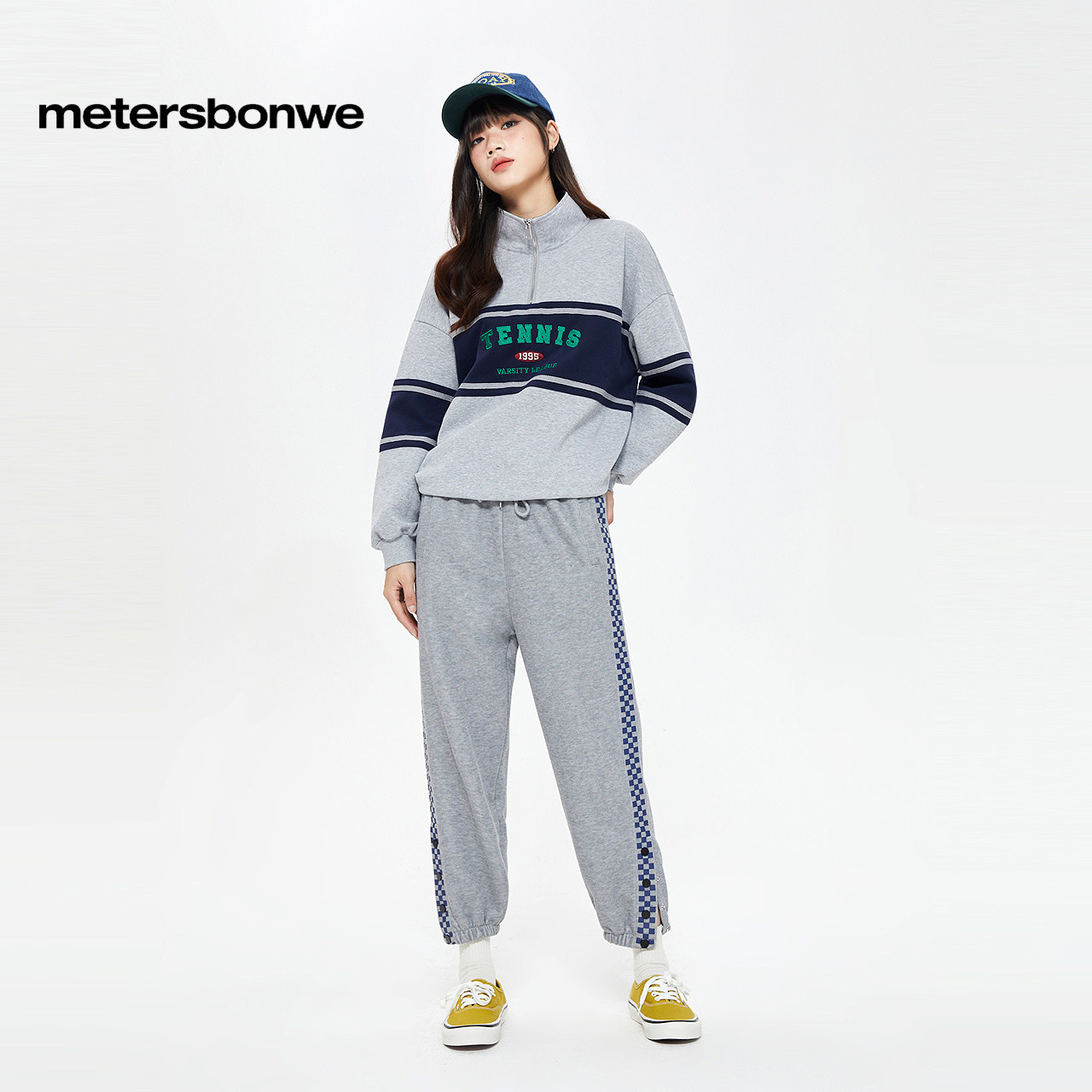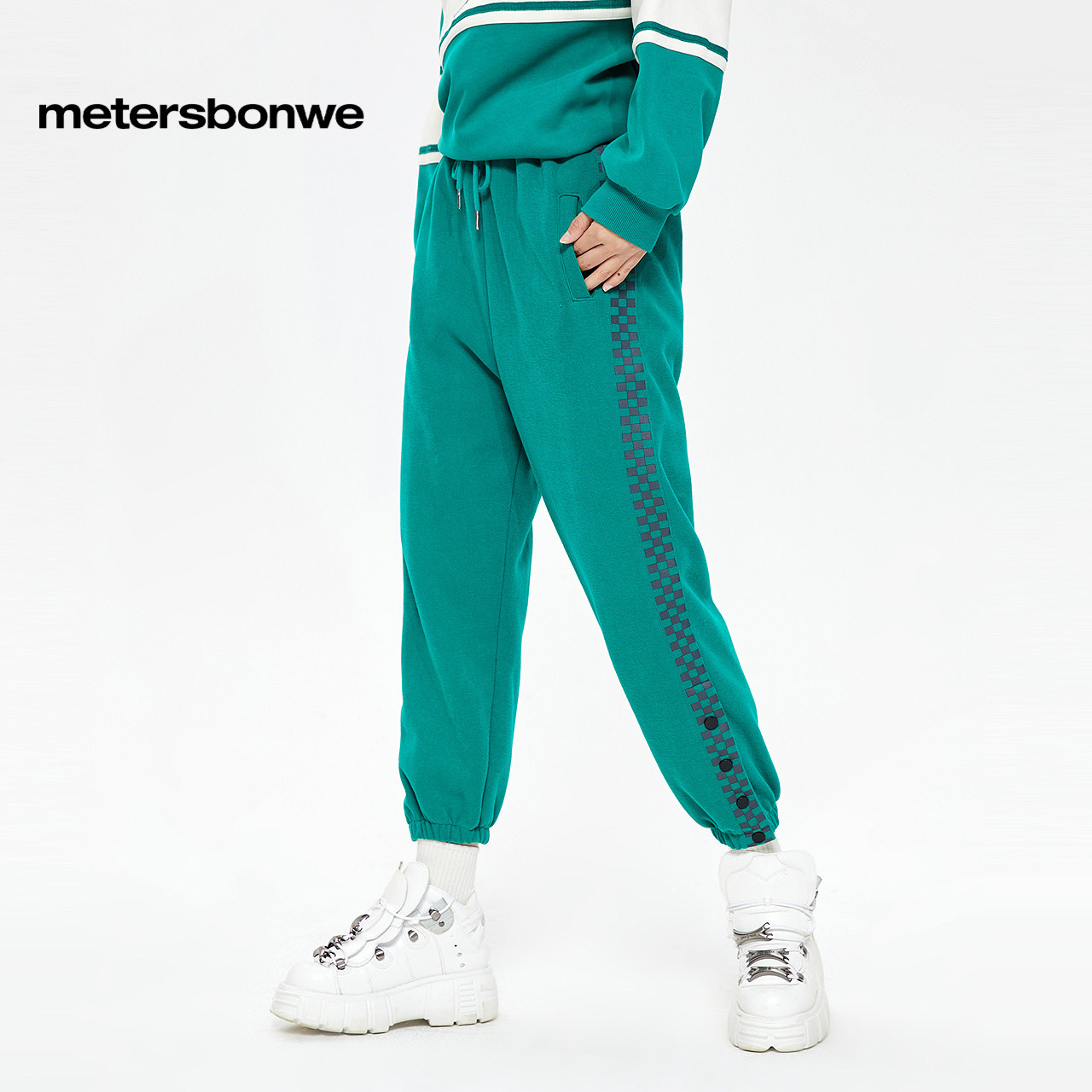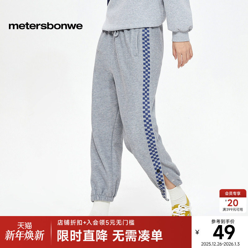 美特斯邦威休闲裤女士春季新款休闲时尚复古直筒格纹裤卫裤下装女