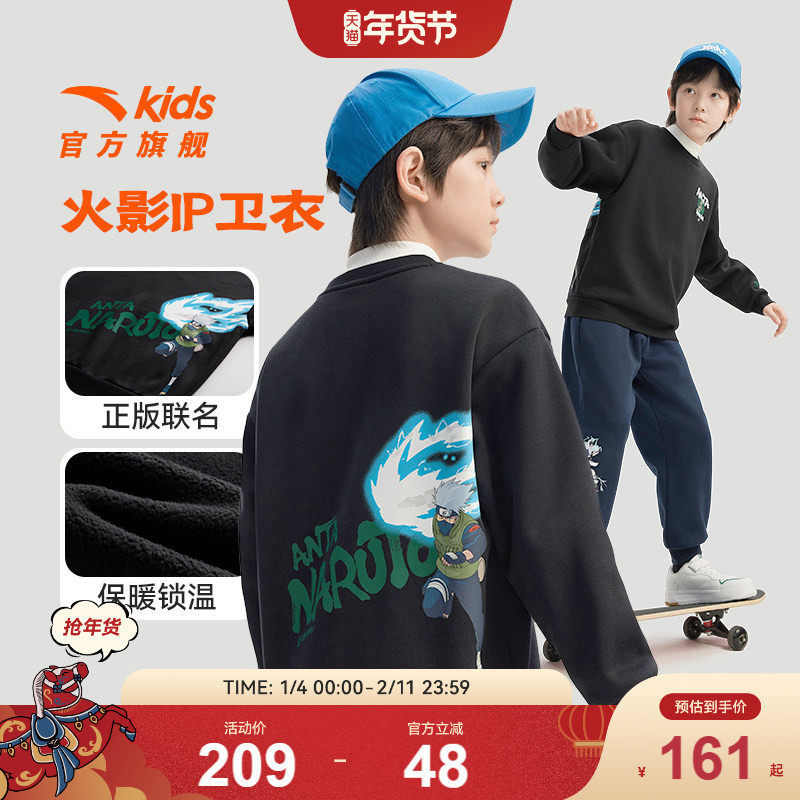火影忍者IP安踏儿童男童加绒卫衣2025新款大童潮酷黑色套头衫上衣