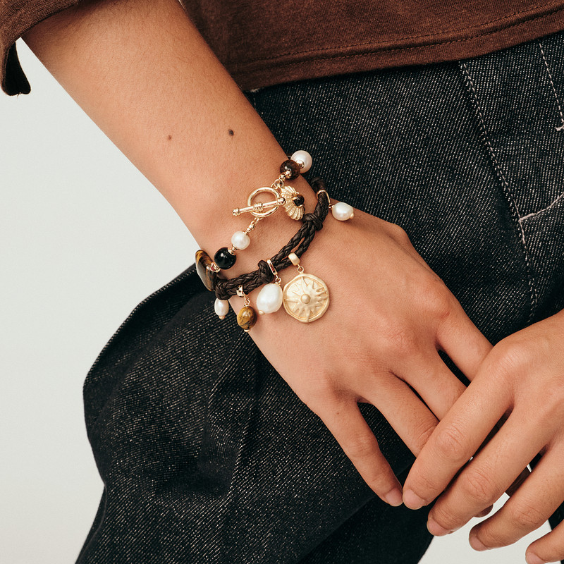 皮编绳结叠搭手链 虎眼石玛瑙珍珠寓意财富