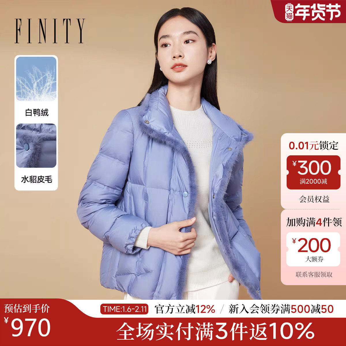 FINITY菲妮迪羽绒服2025冬季新款90白鸭绒高端水貂毛领短款外套女