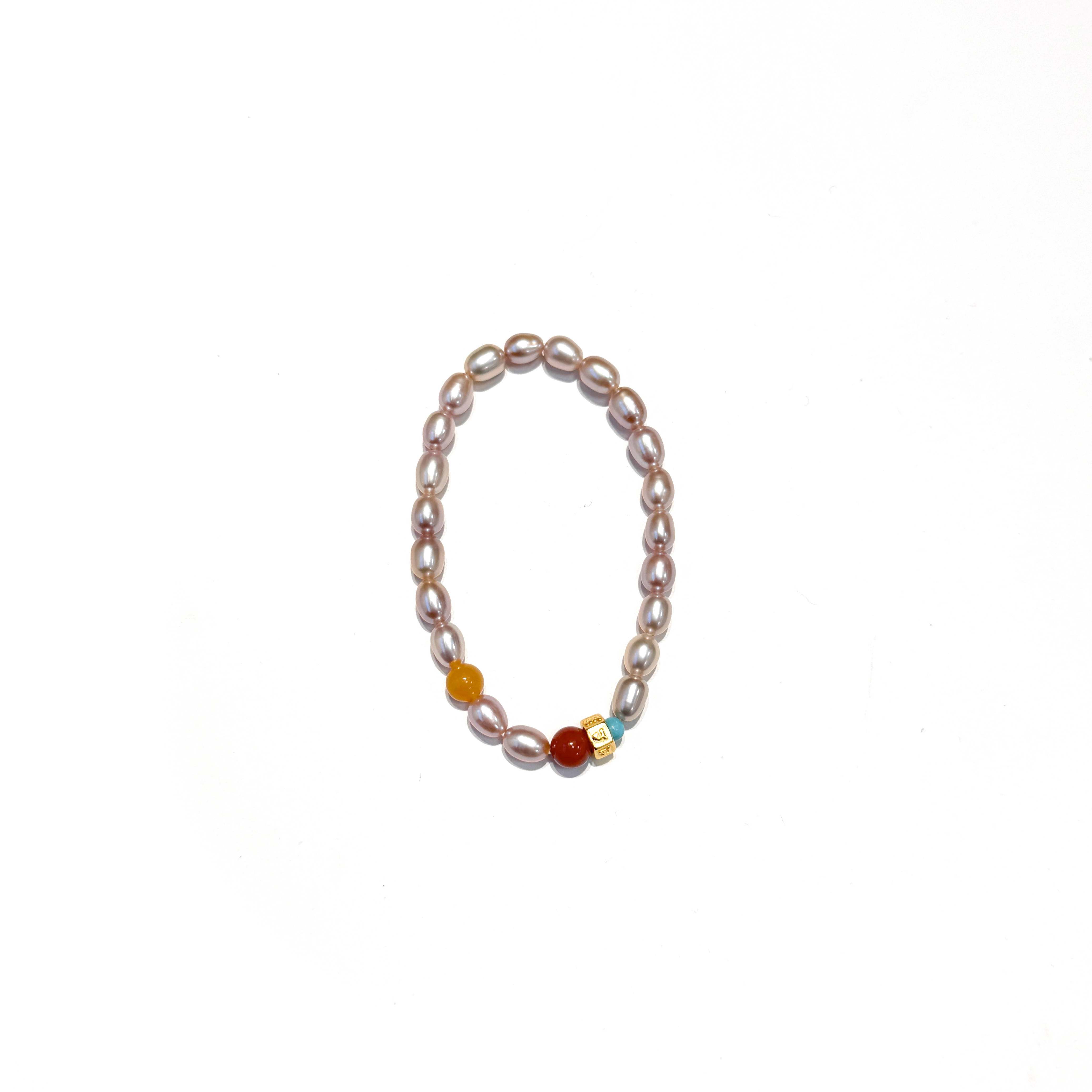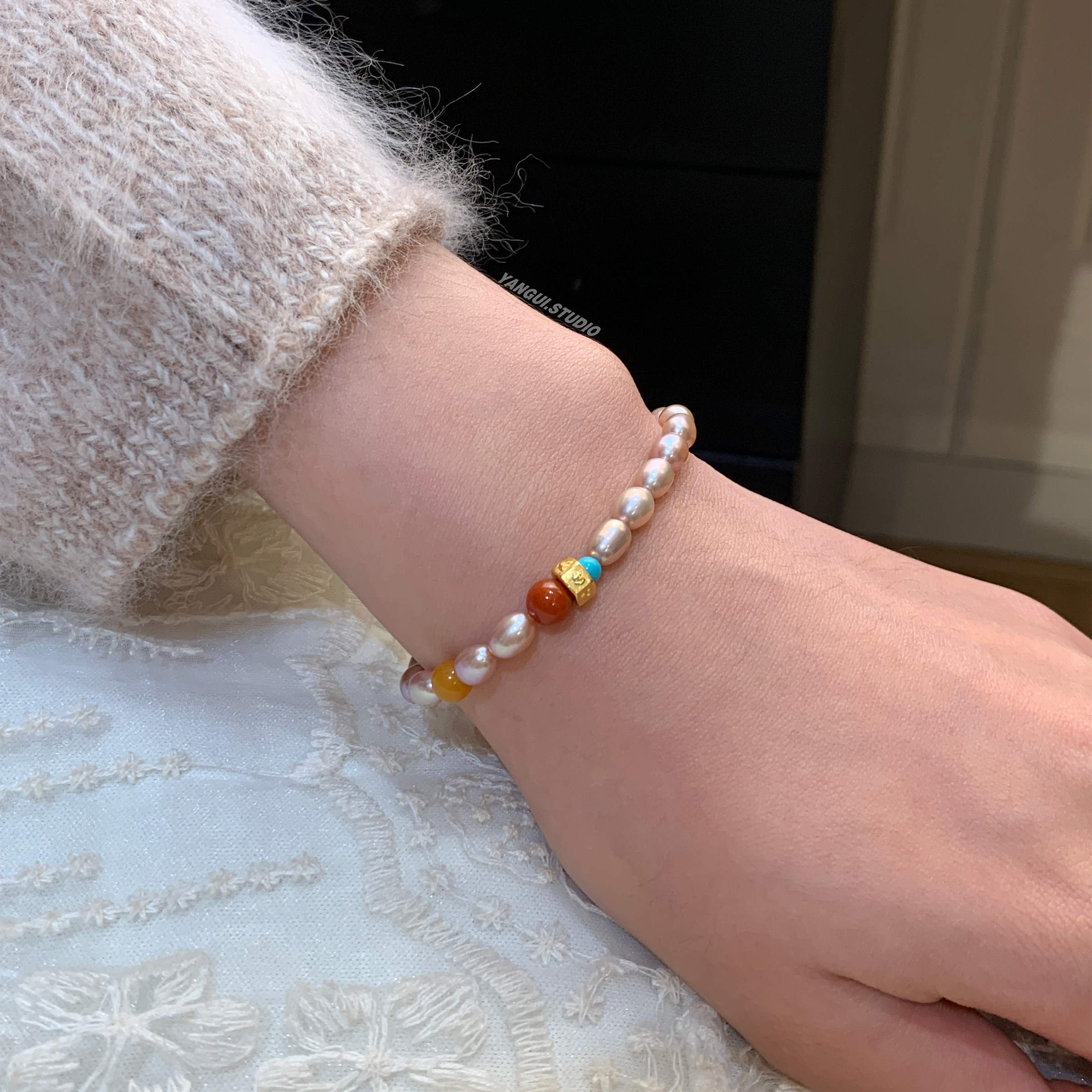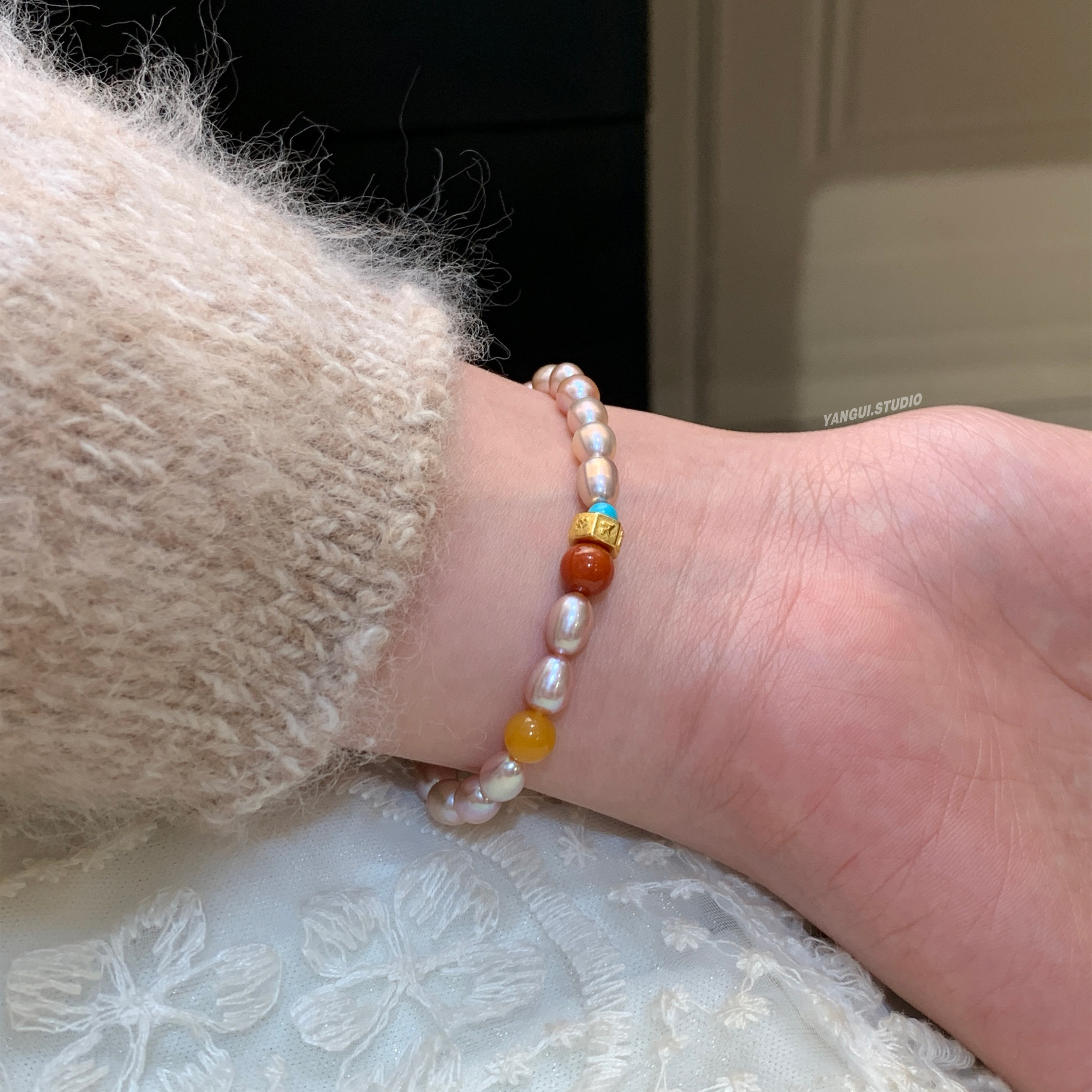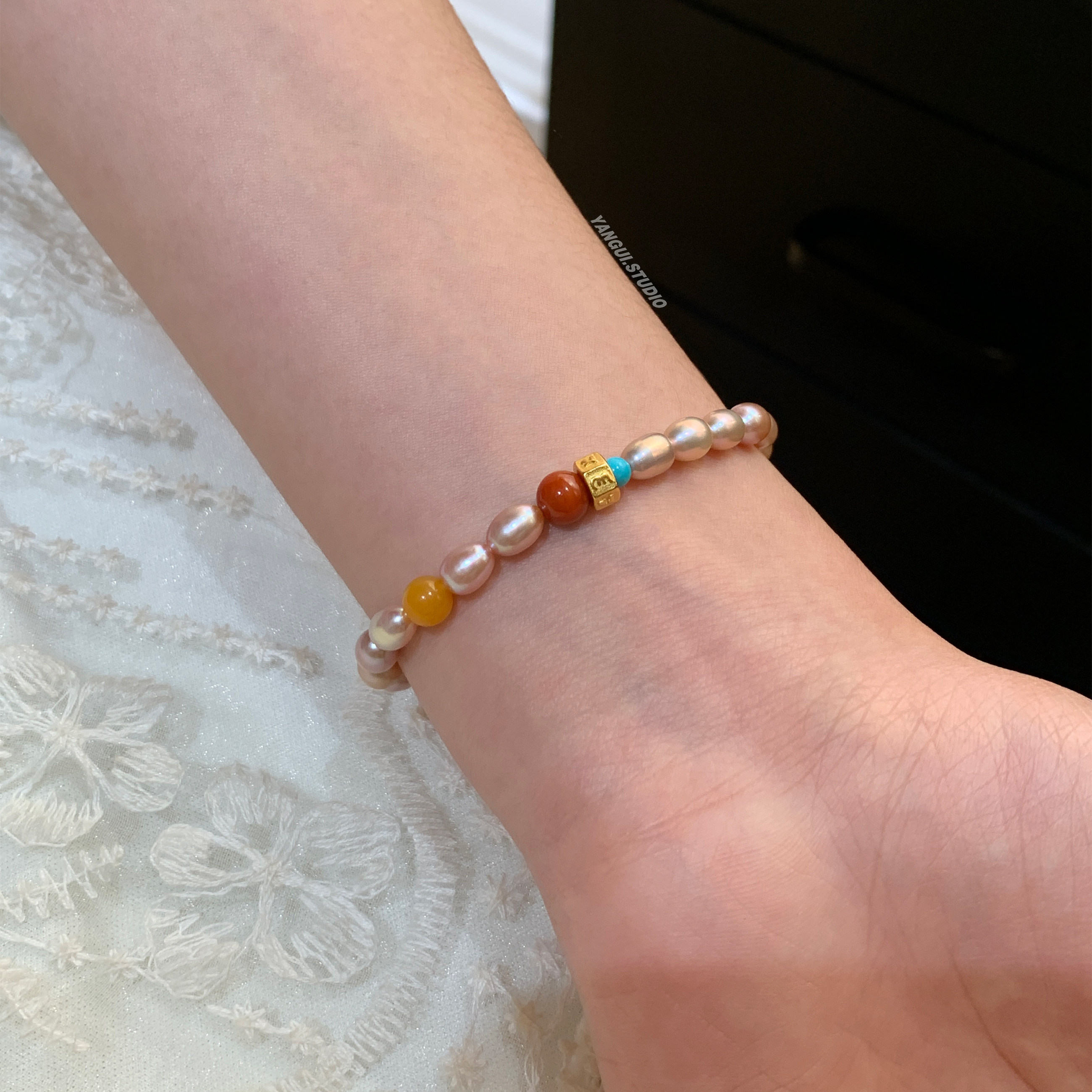 Yangui原创「粉韵珍珠」国风轻奢重工淡水珍珠纯银南红弹力手链女