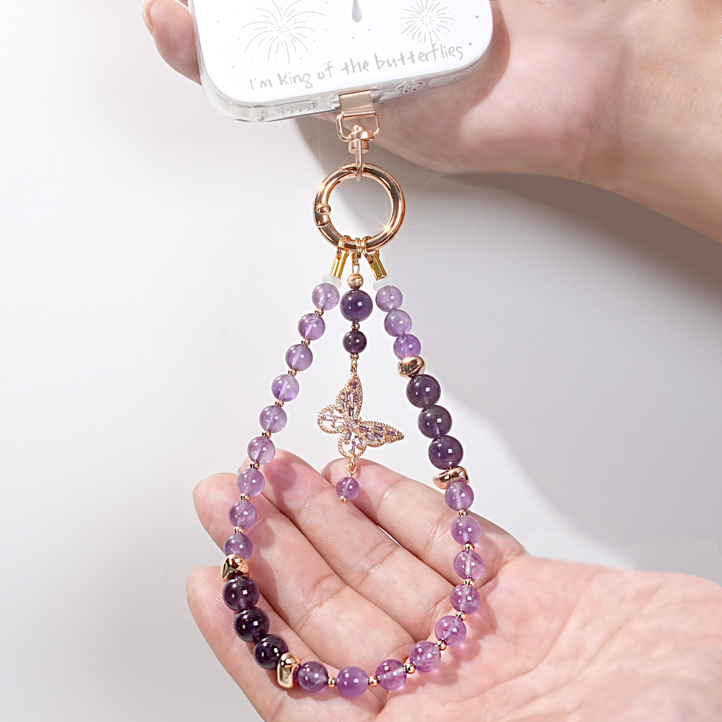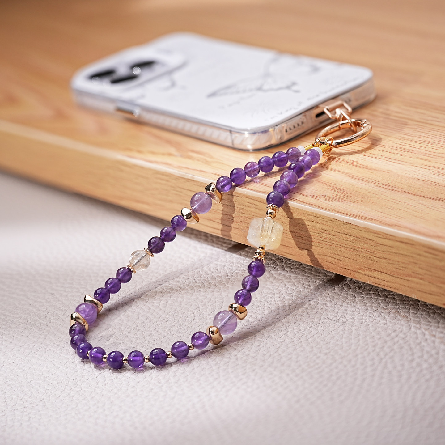 天然水晶紫水晶合金锆石精致招财运祈福钢绳手机挂链车钥匙扣链