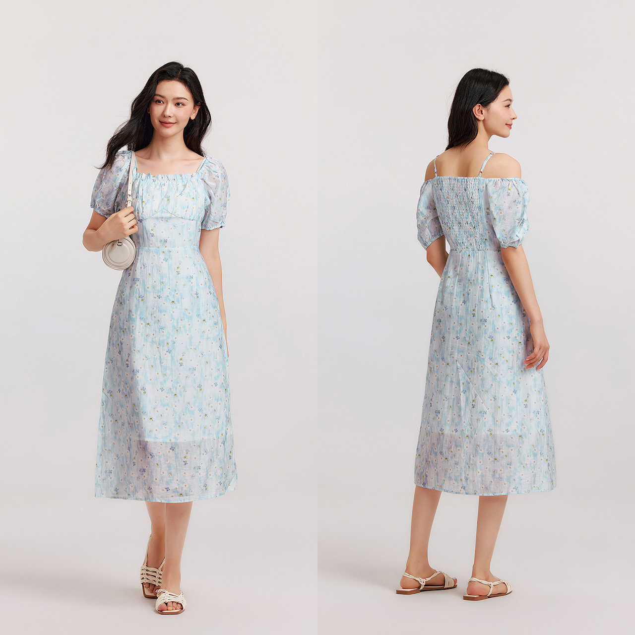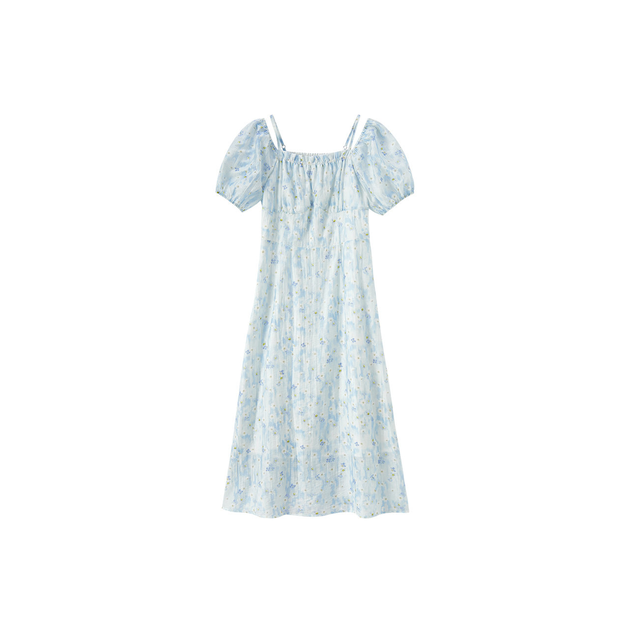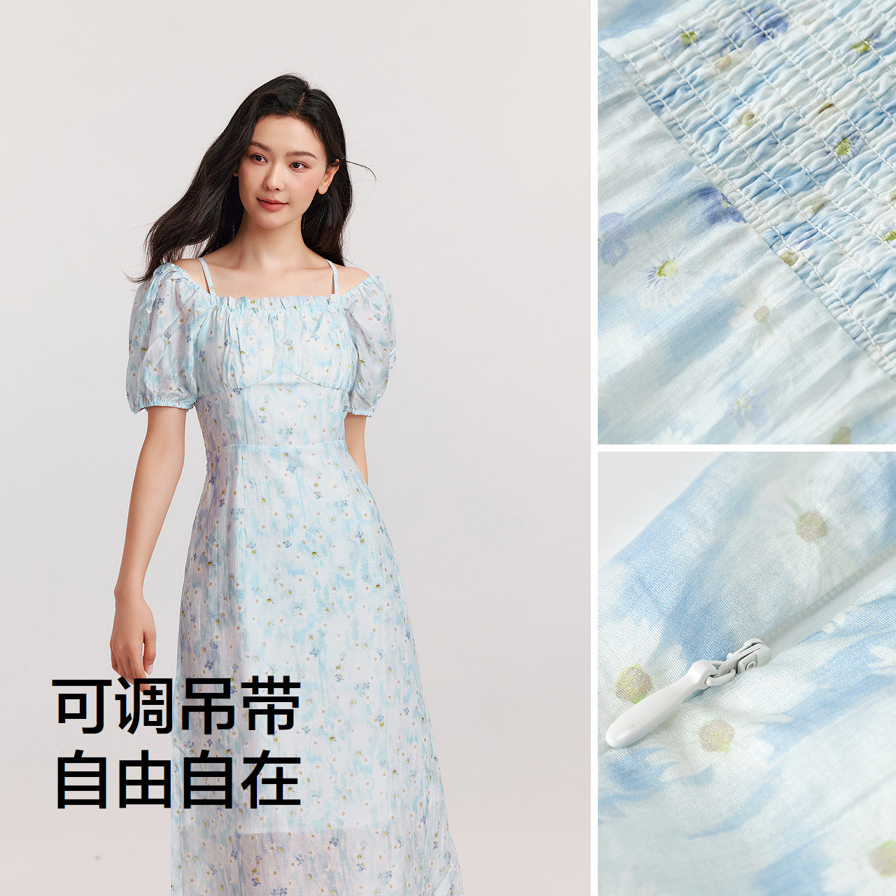 森马连衣裙女一字肩方领吊带修身长裙温柔夏浪漫肌理碎花裙小清新