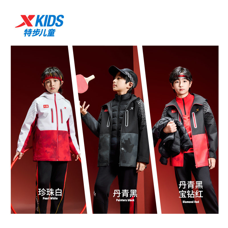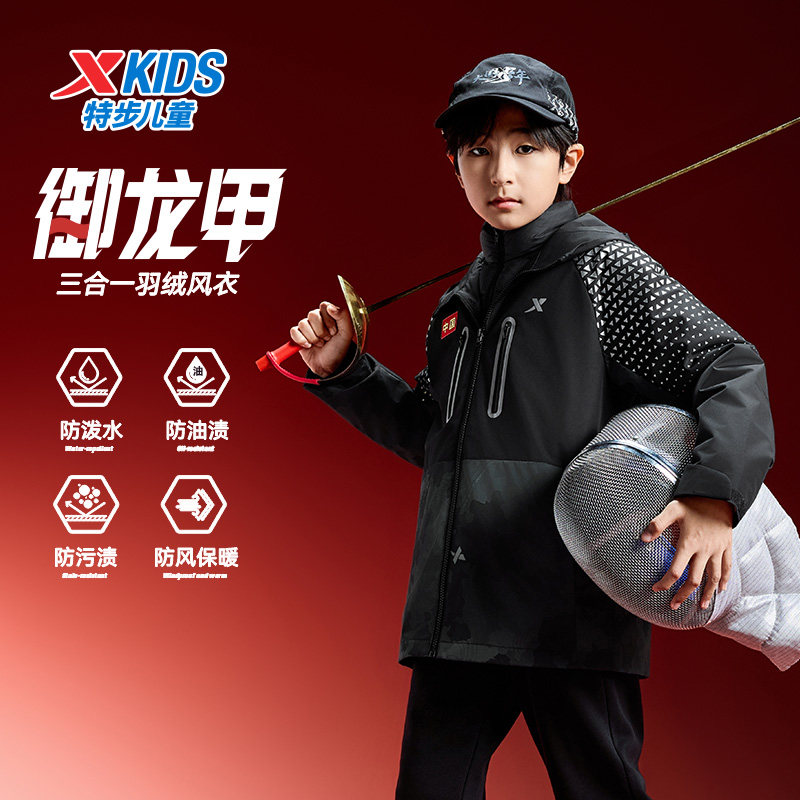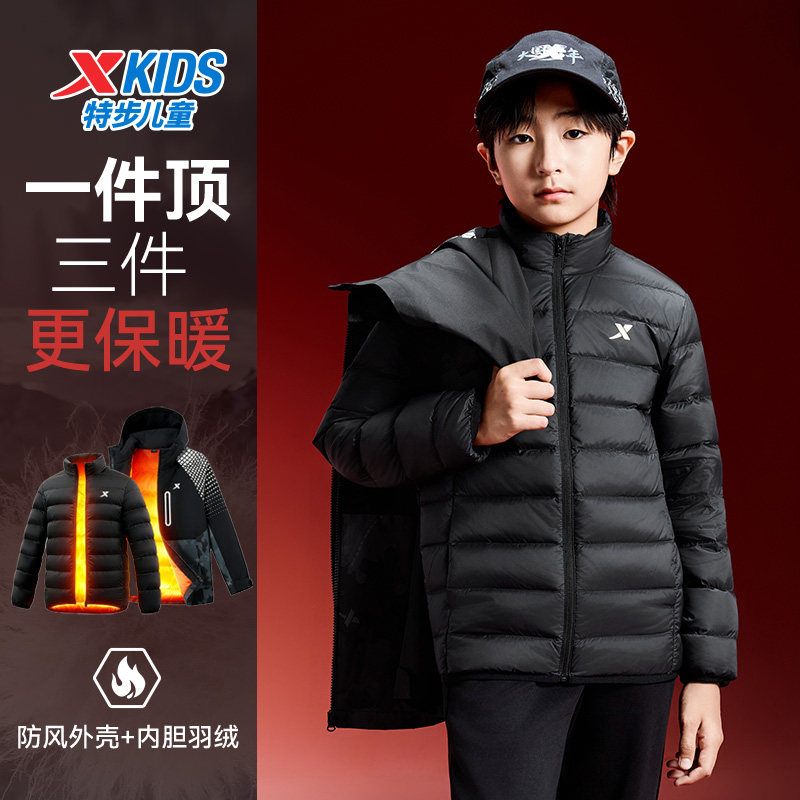 特步童装秋冬新款男童保暖休闲两件套儿童运动连帽防风三合一风衣