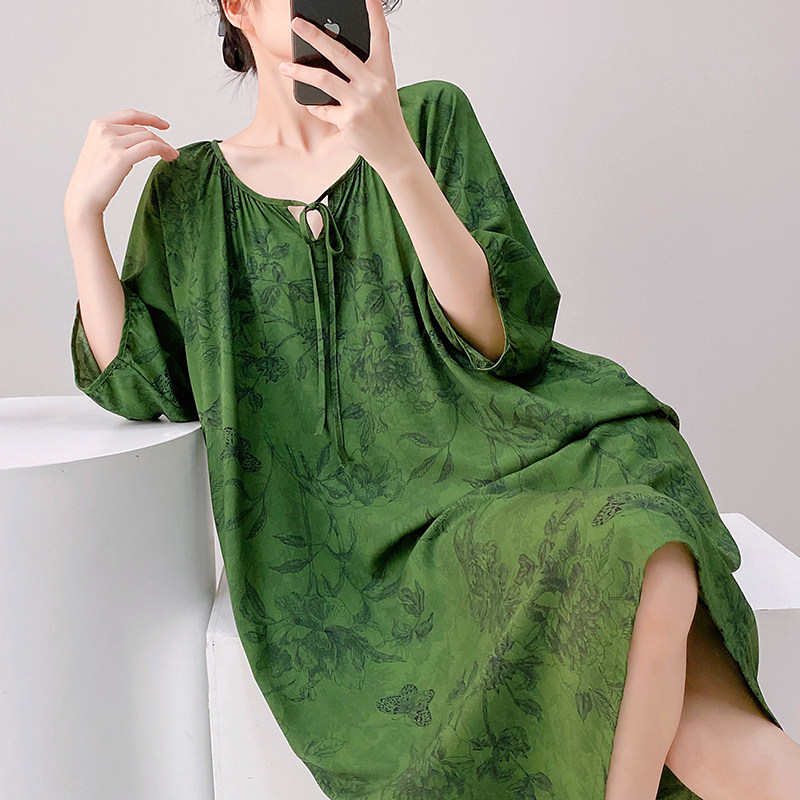 韩版加长款棉绸睡裙女士短袖加大码睡衣夏季人造棉宽松舒适居家服
