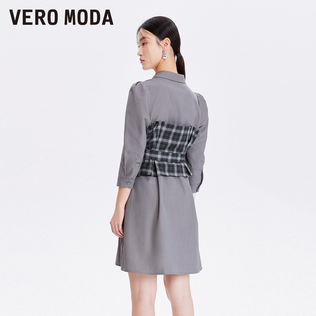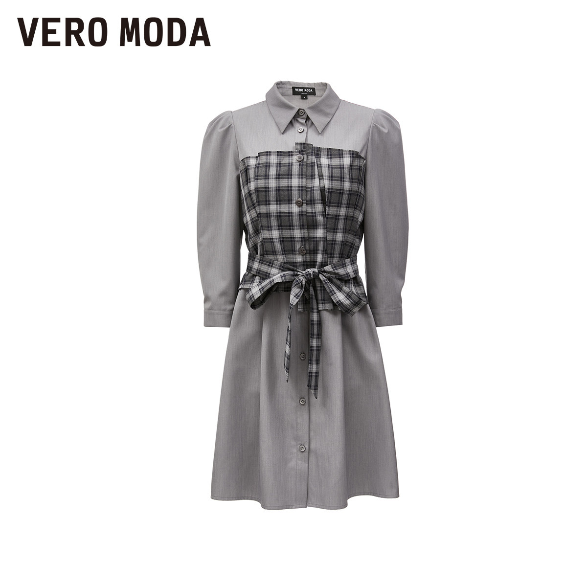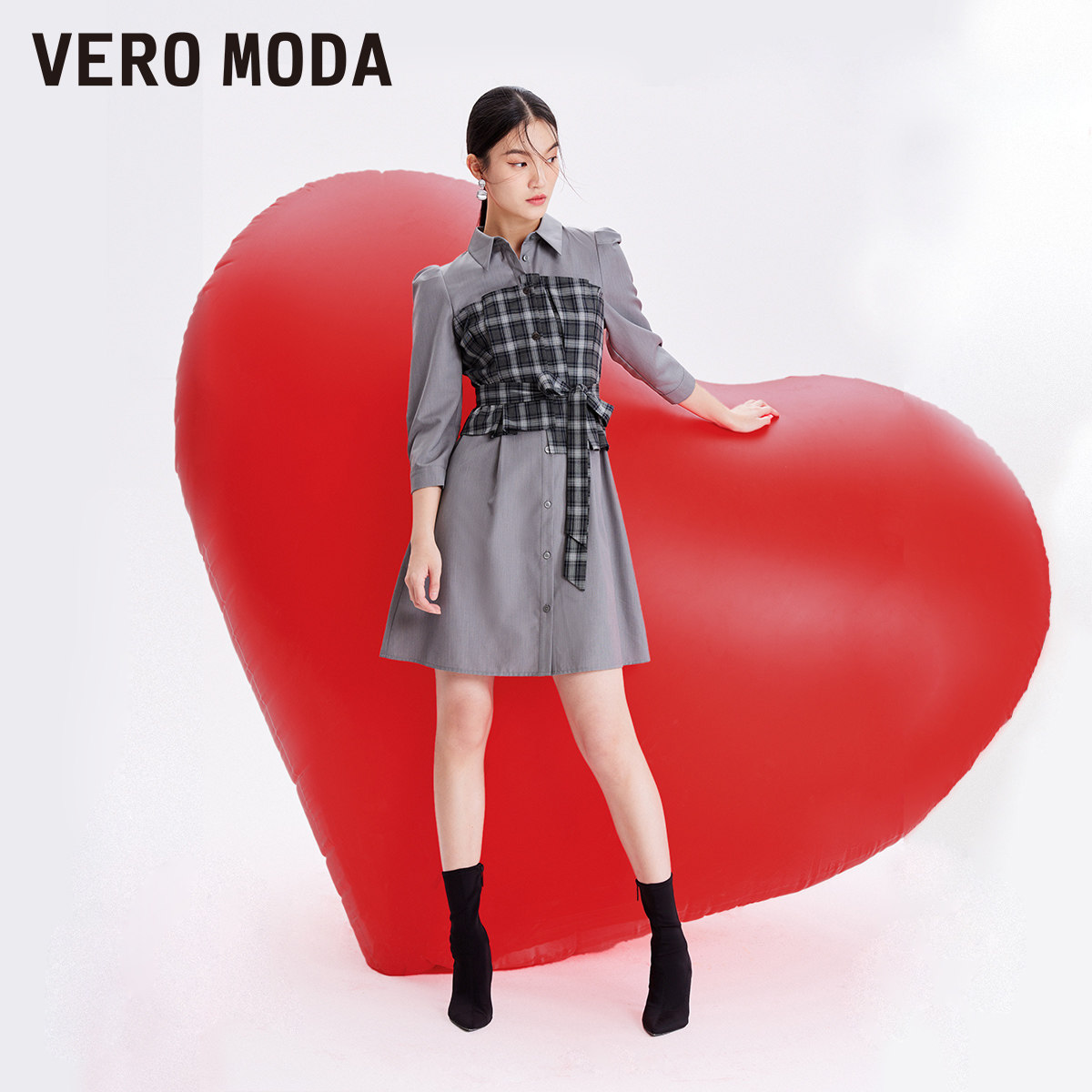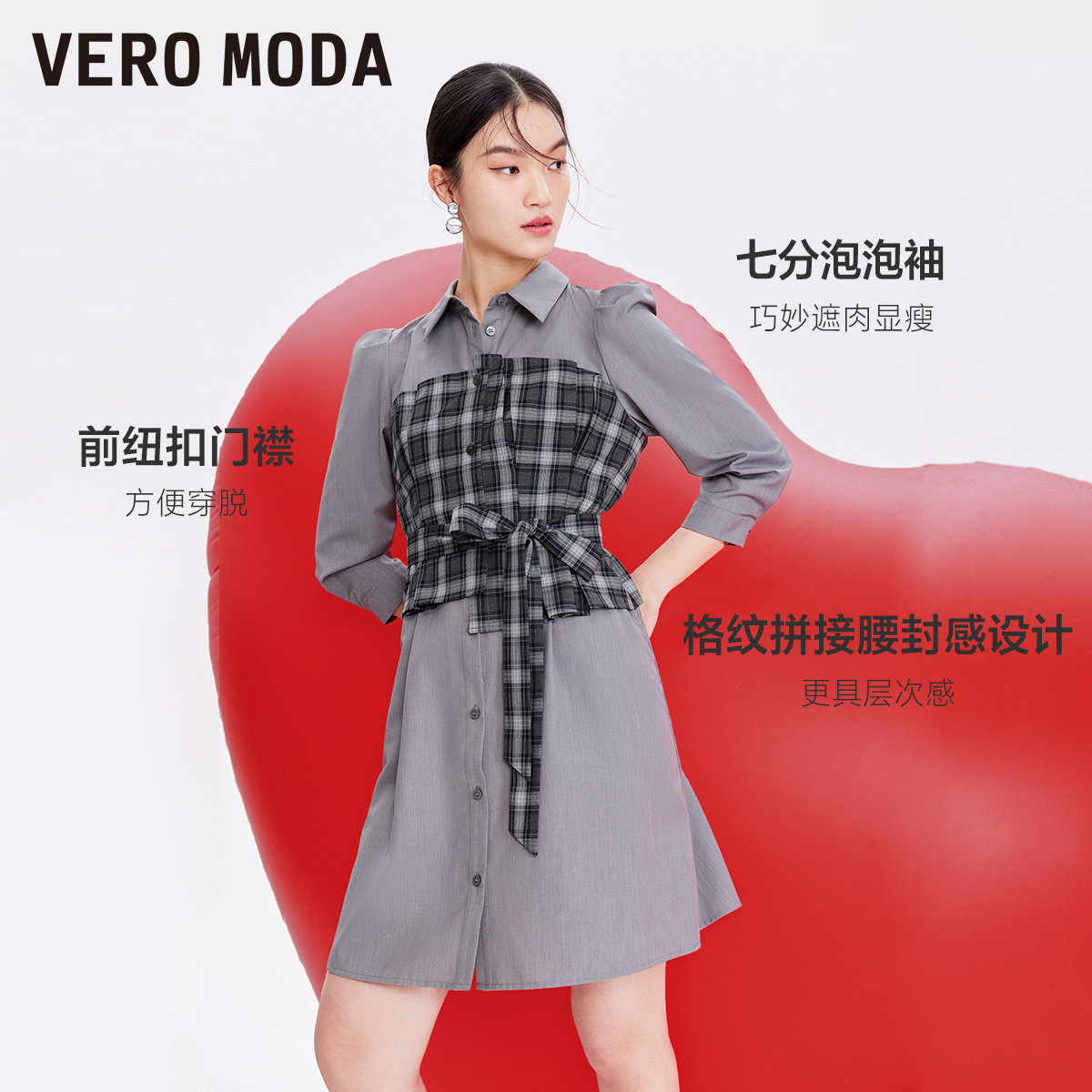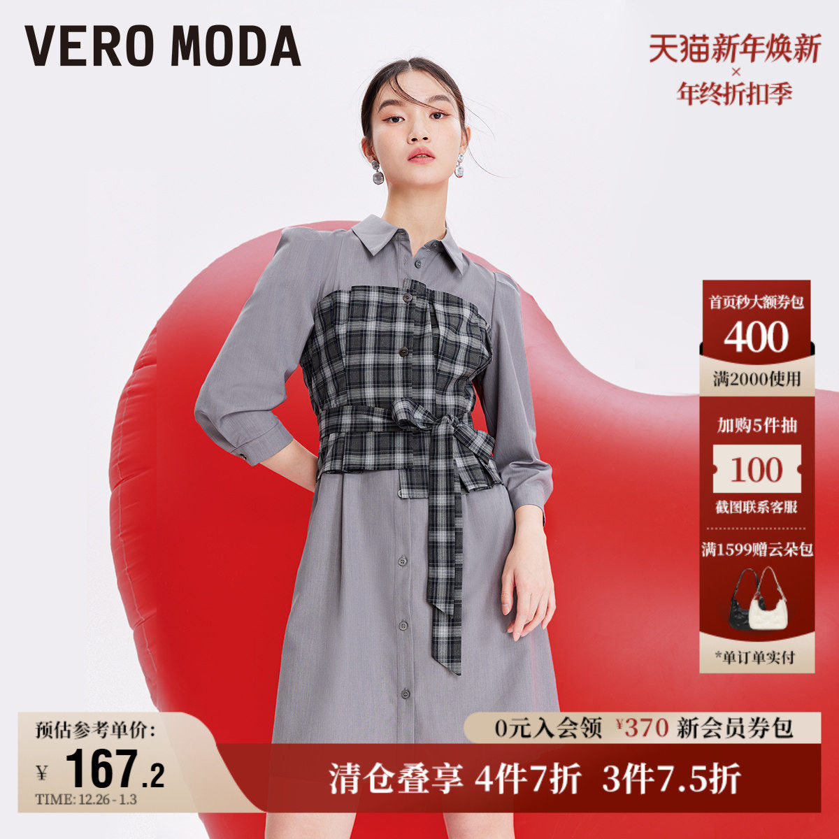 Vero Moda奥莱连衣裙子秋冬清仓格纹拼接优雅显瘦七分袖翻领女