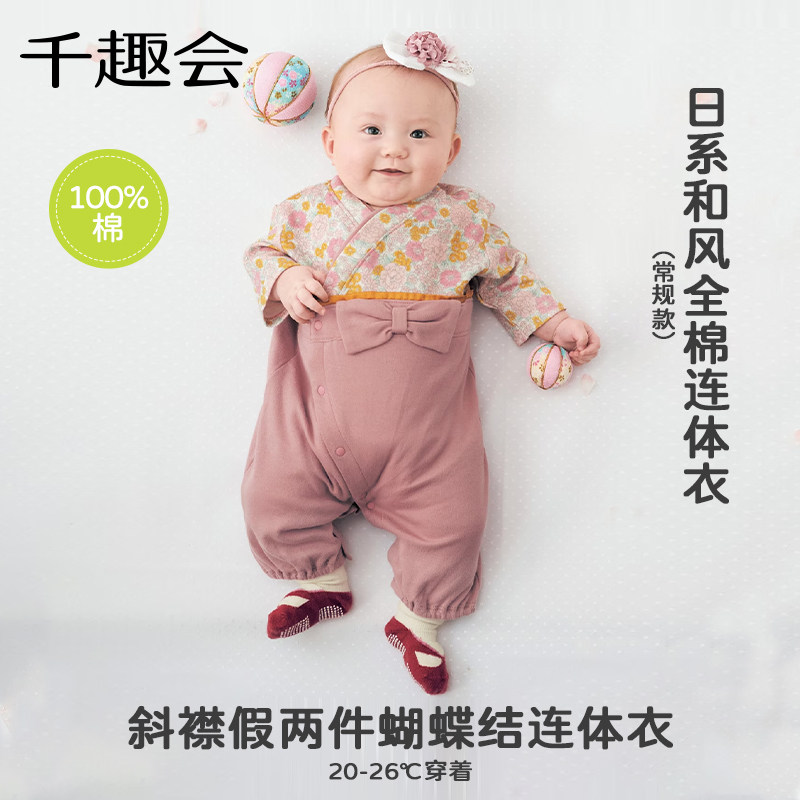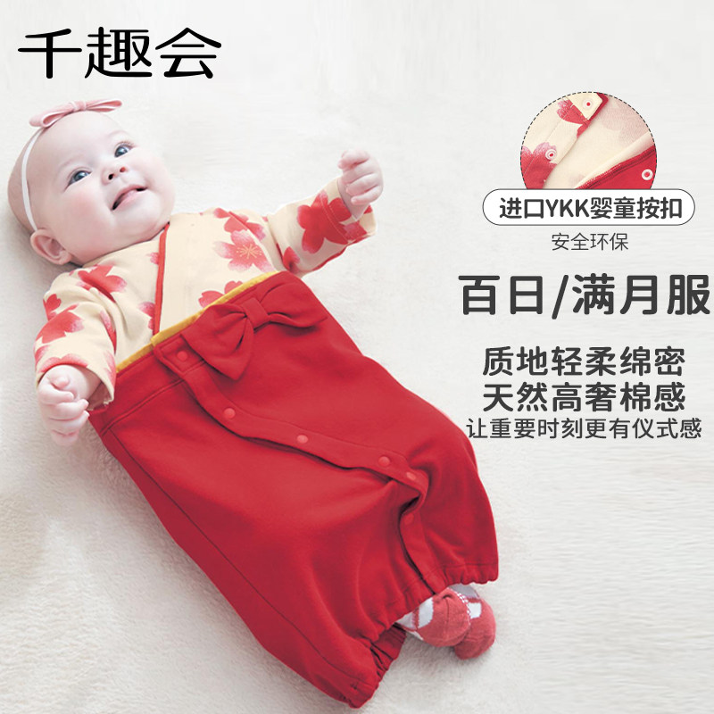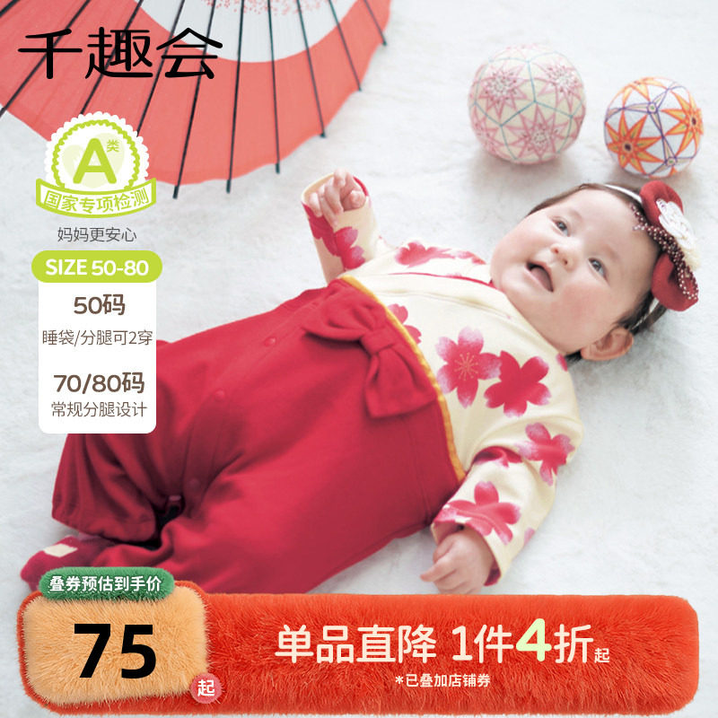 千趣会25年红色春秋款婴童满月服两穿纯棉女童宝宝连体衣爬服