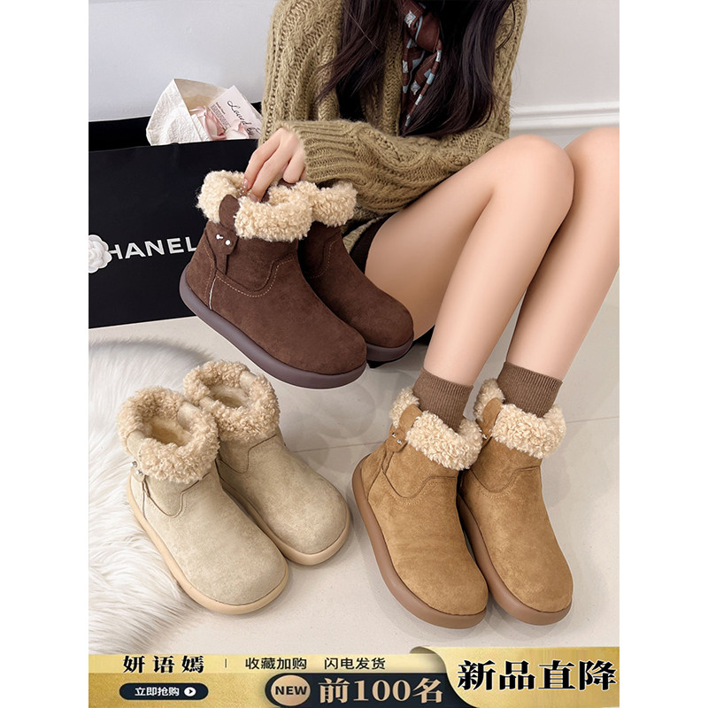 低帮厚底雪地靴女2025新款冬季懒人一脚蹬毛毛棉鞋加绒加厚女鞋子