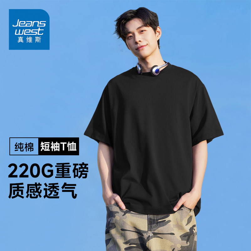 GV真维斯纯棉短袖t恤男2025新款夏重磅黑色男士男款纯色宽松半袖A